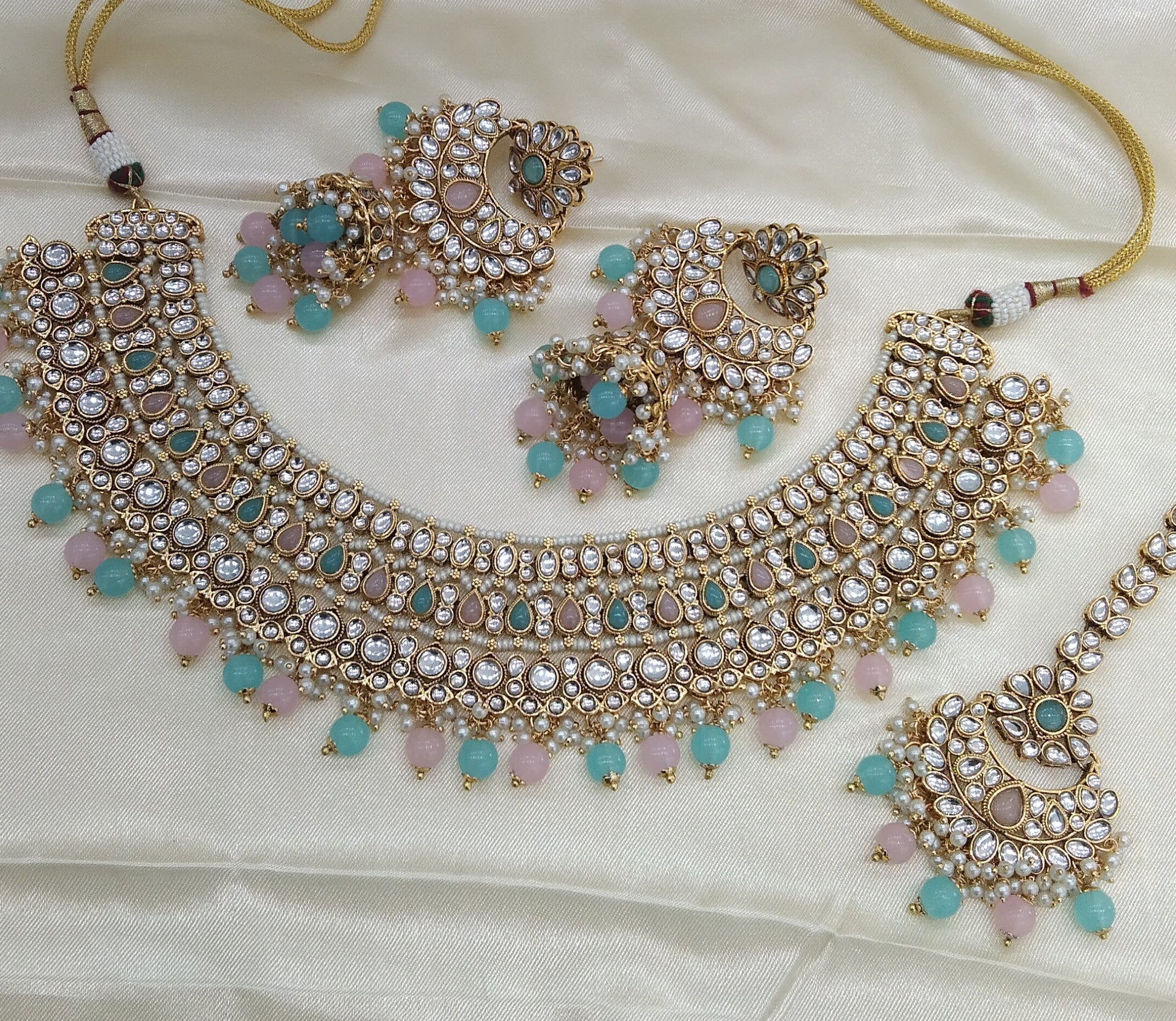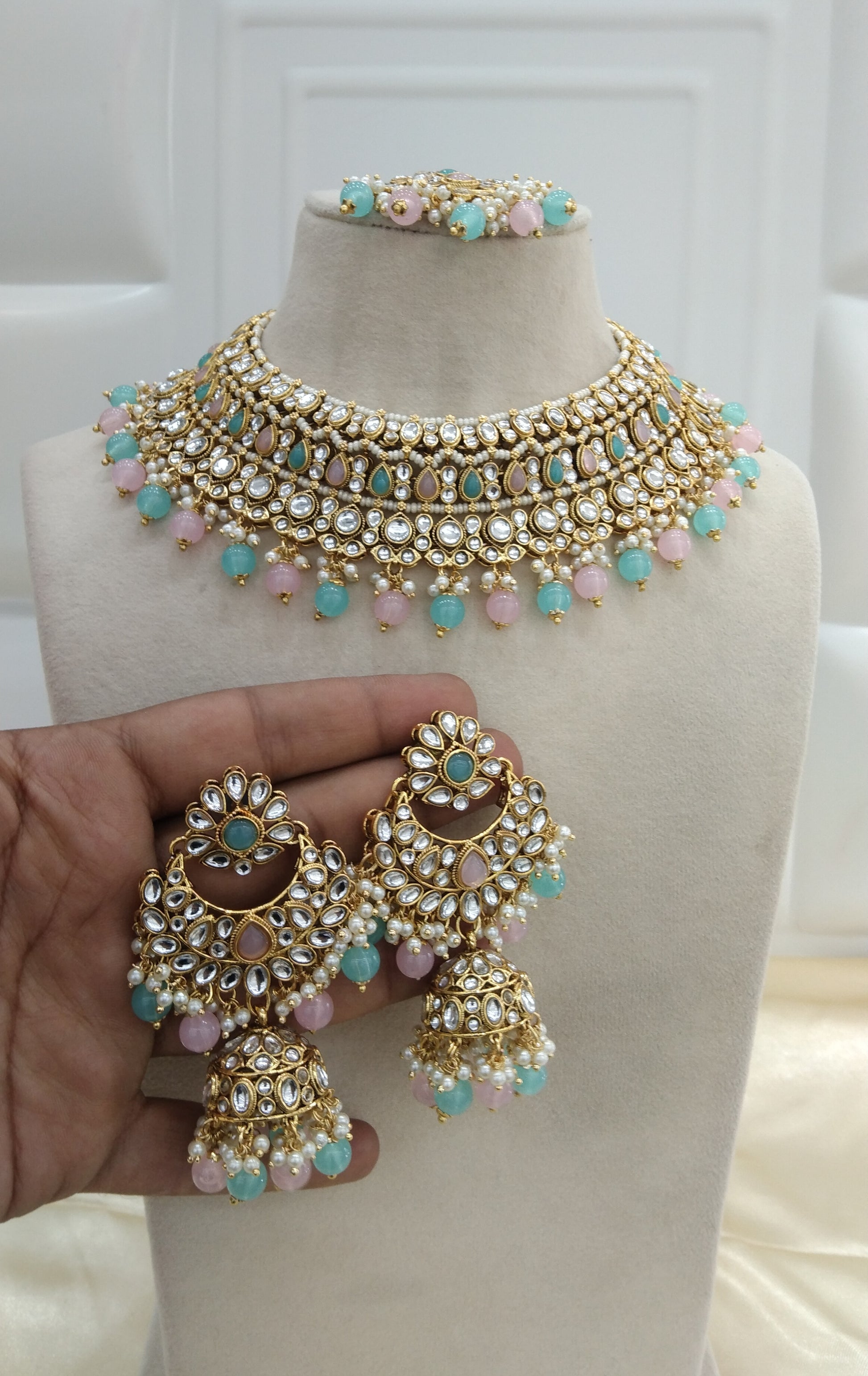 Nuri Sky blue Pink kundan Indian Necklace Jewellery Set