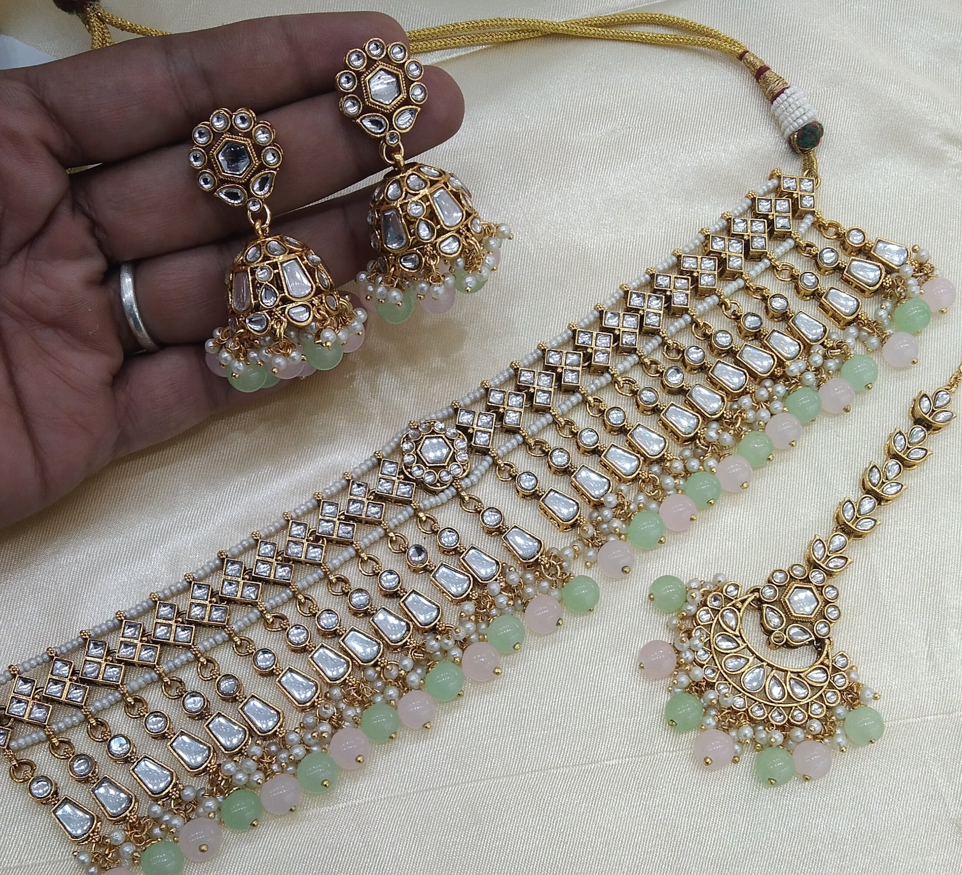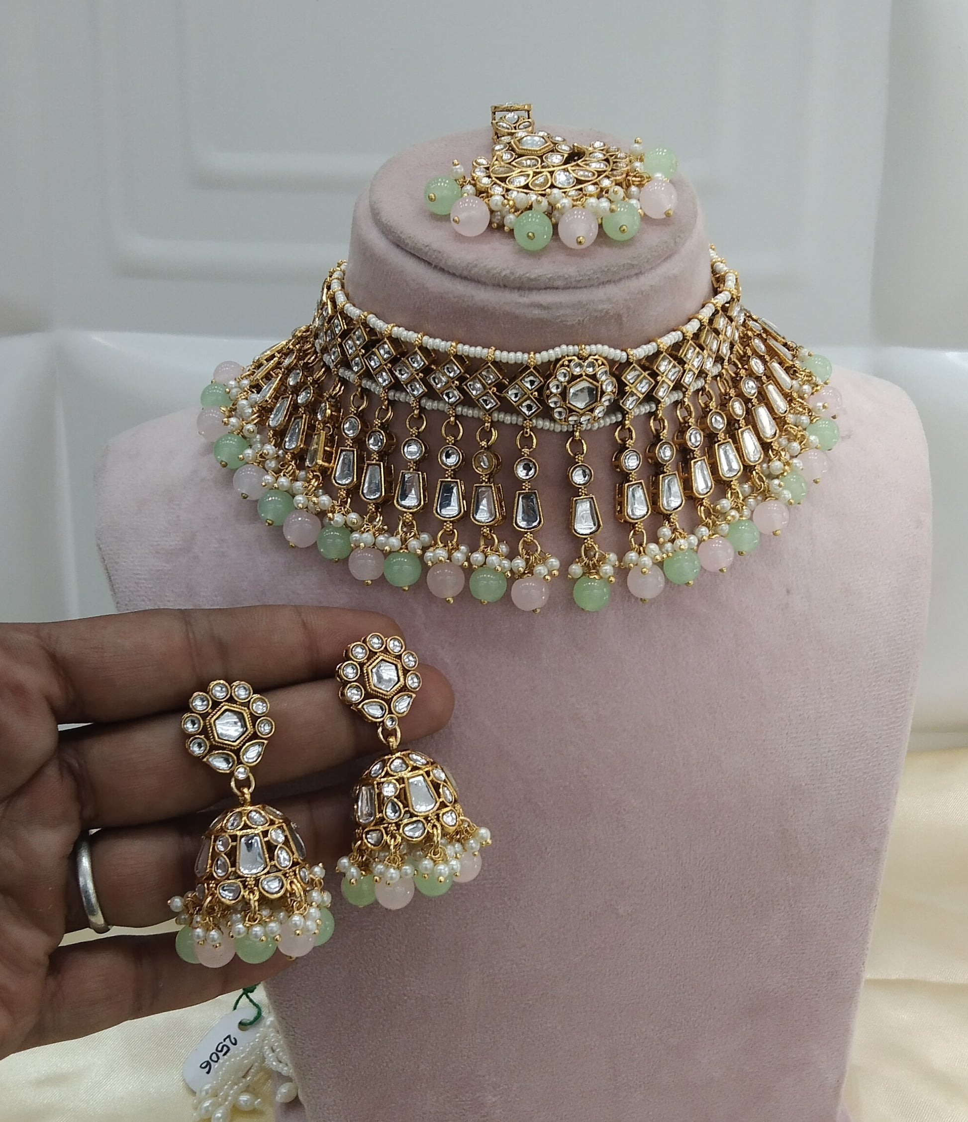 Orignal Pista Pink kundan Indian Choker Jewellery Set
