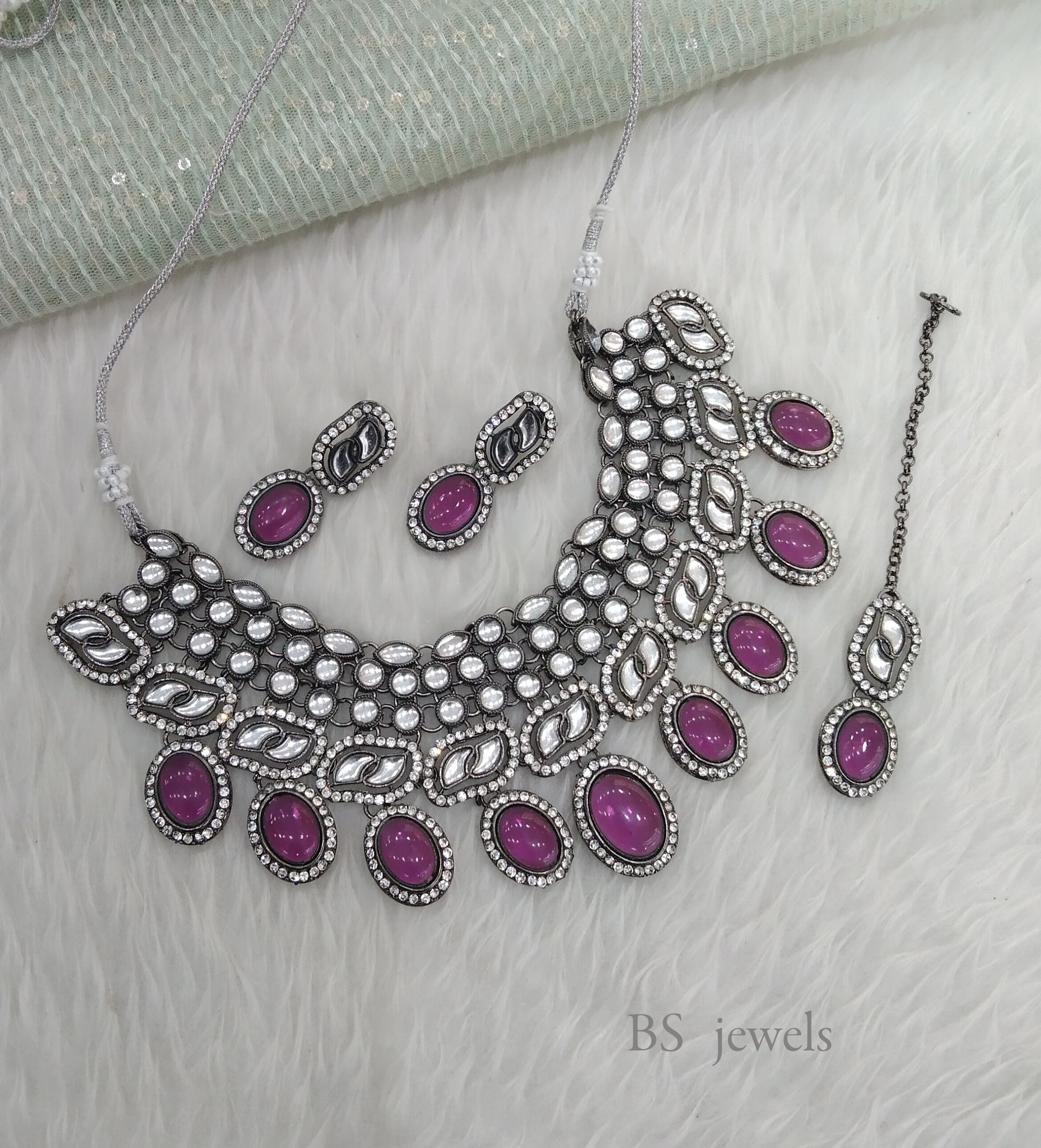 Oxidized Majenta kundan necklace Set/ antique silver tribal shelf Jewellery