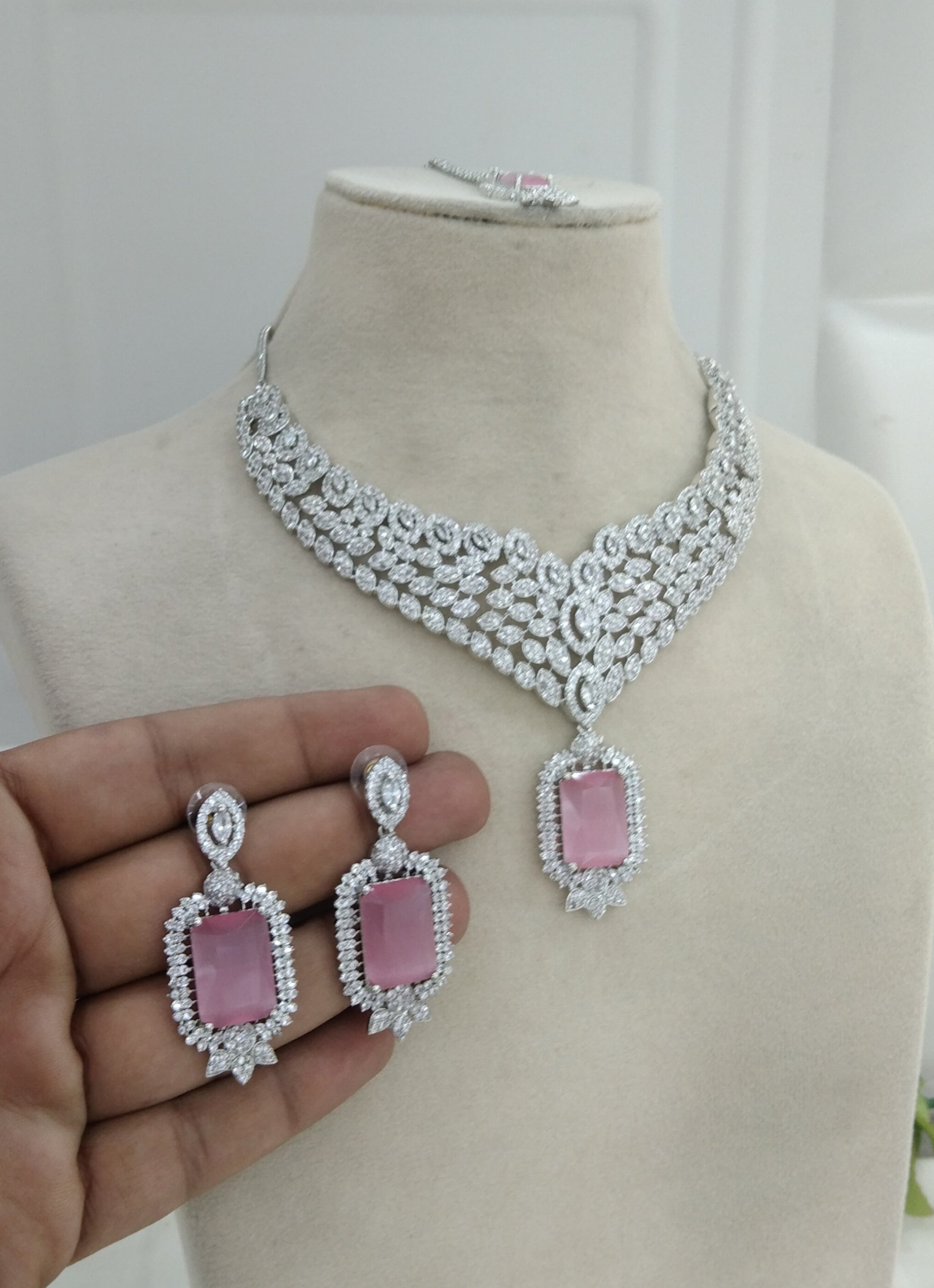 Pink Silver American Diamond Cz Necklace Jewellery Switi Set