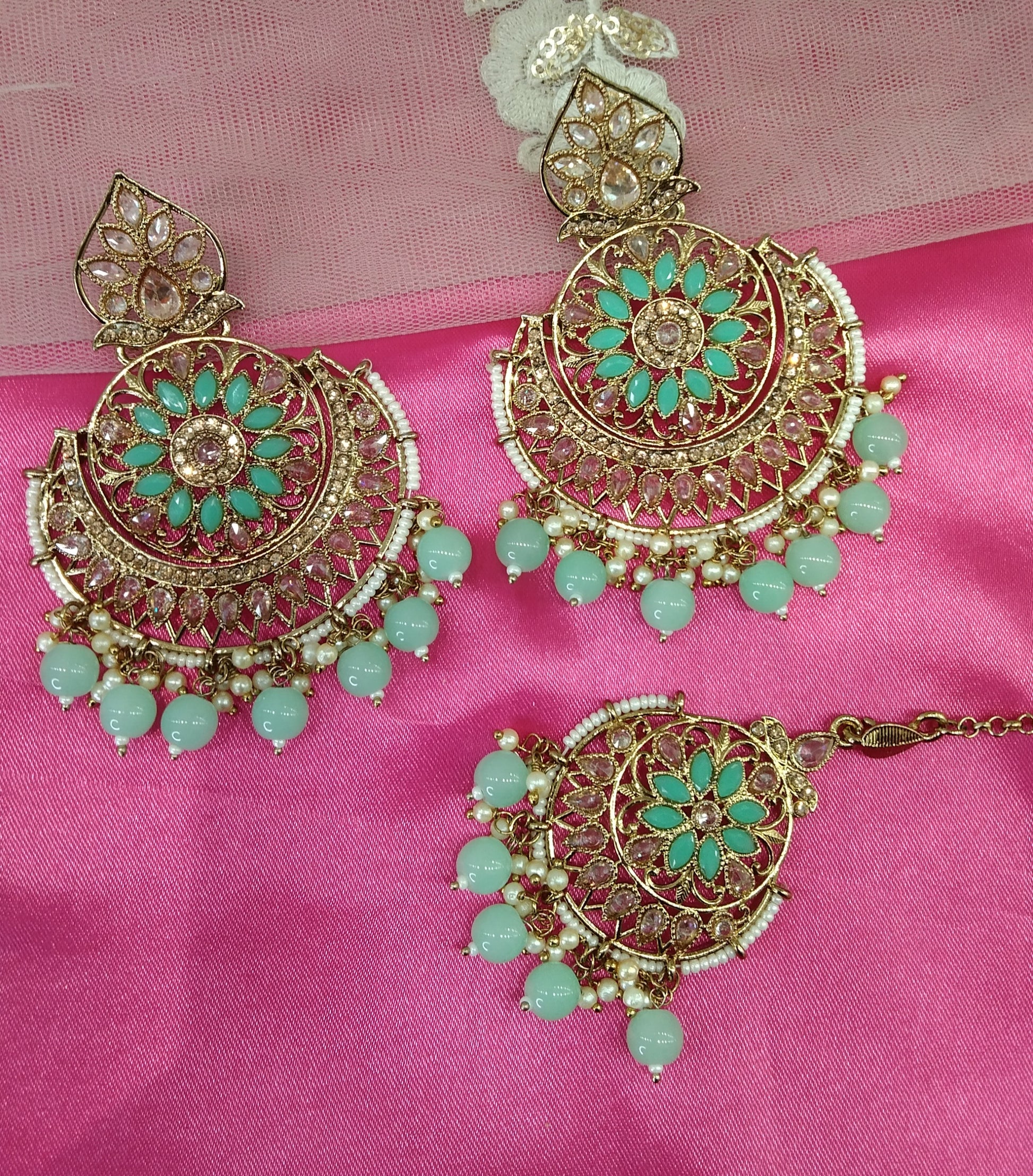 Pista Champagne Gold Reet Bollywood Earrings Tikka Set