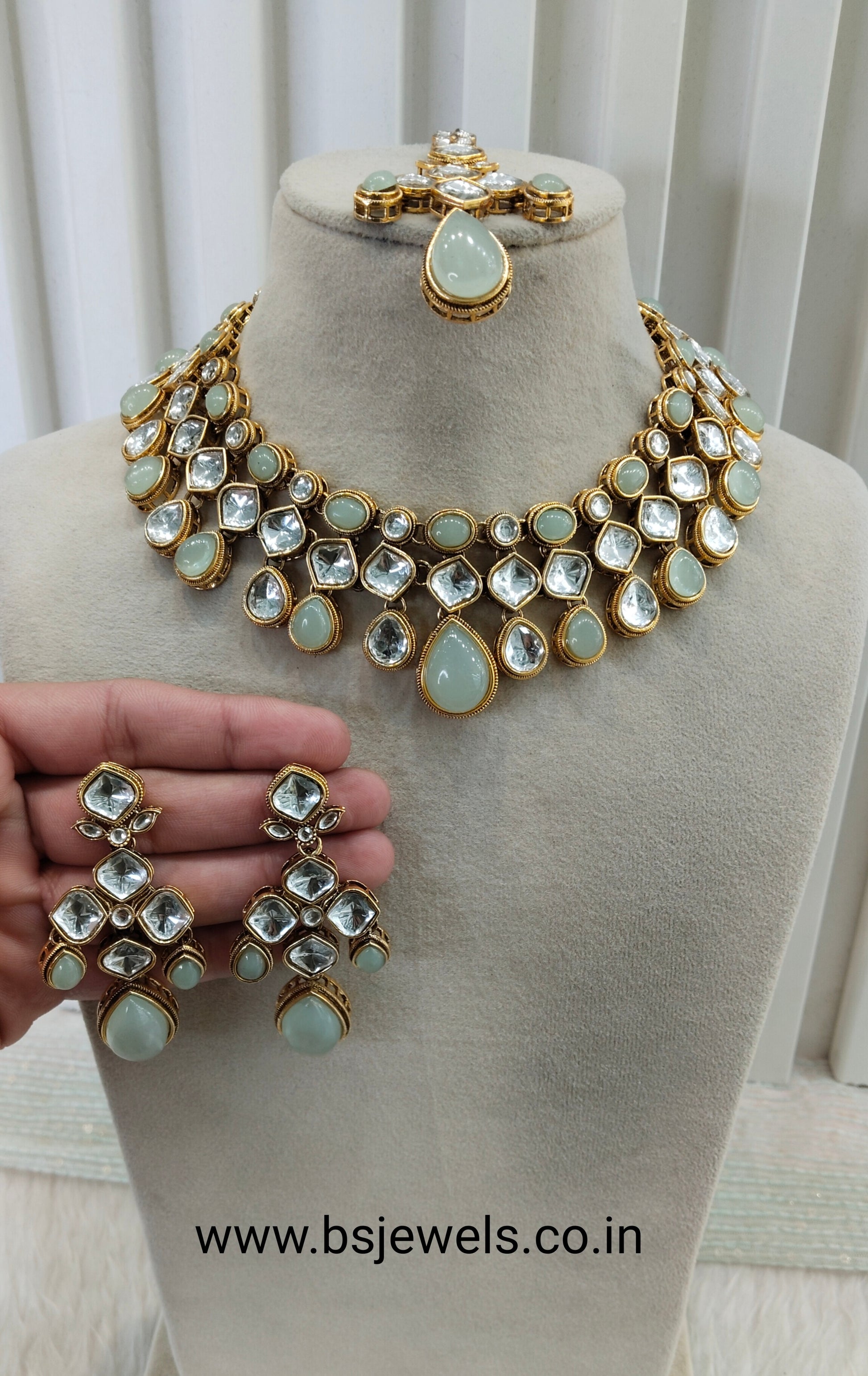 Pista Gold Kundan Necklace Jewellery Raveena Set
