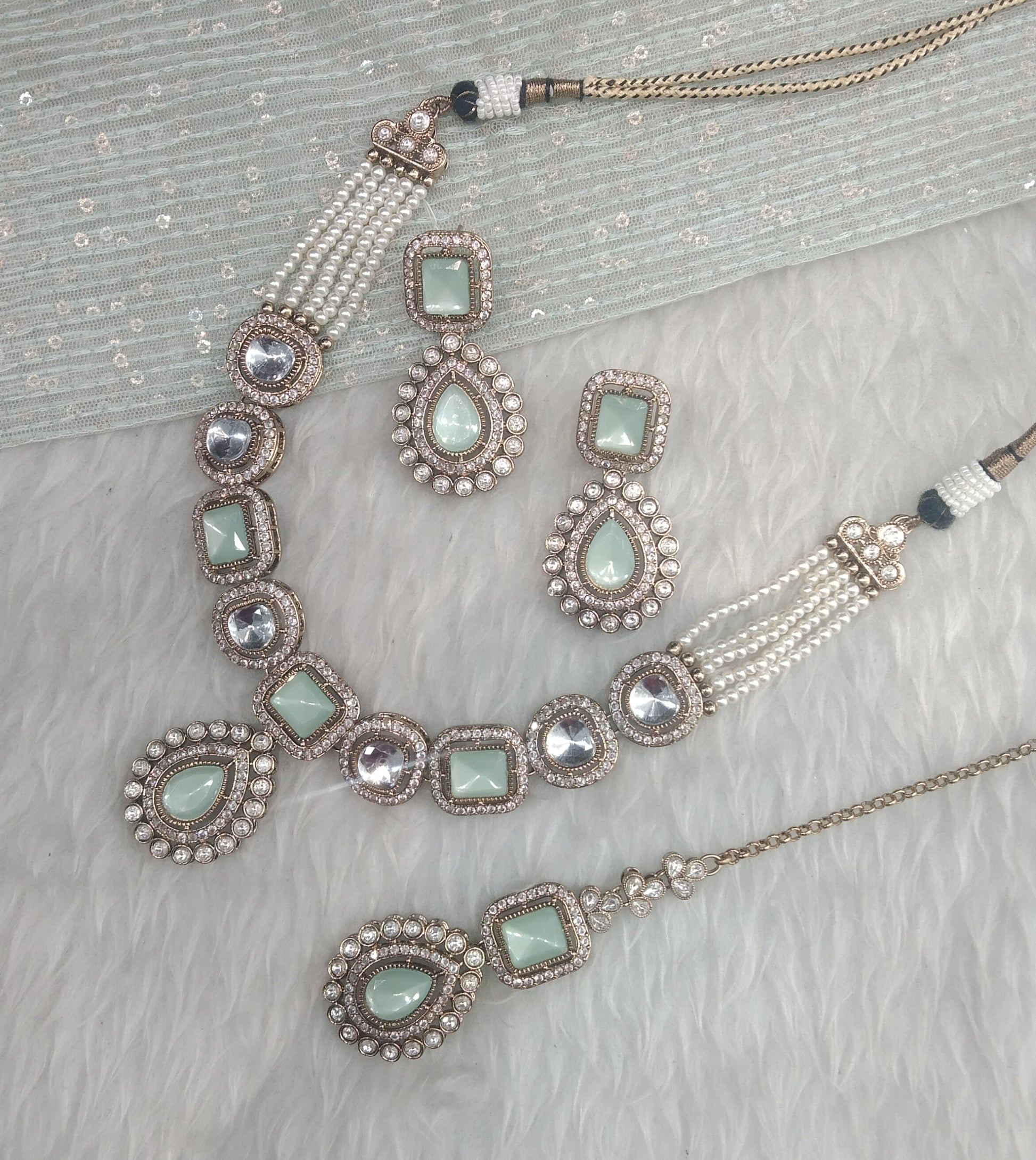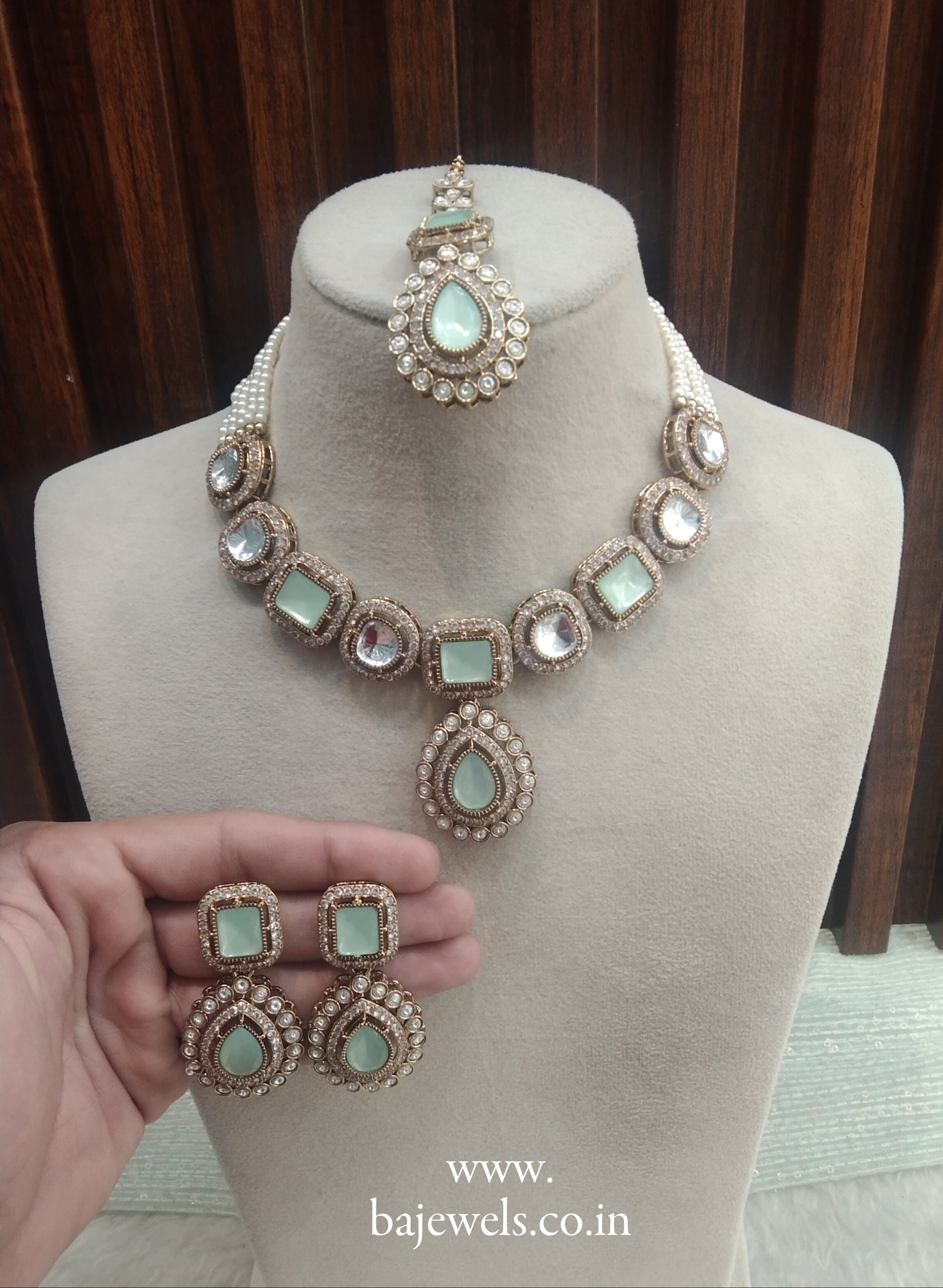 Pista Gold Moissanite Kundan Necklace Jewellery Manddy Set