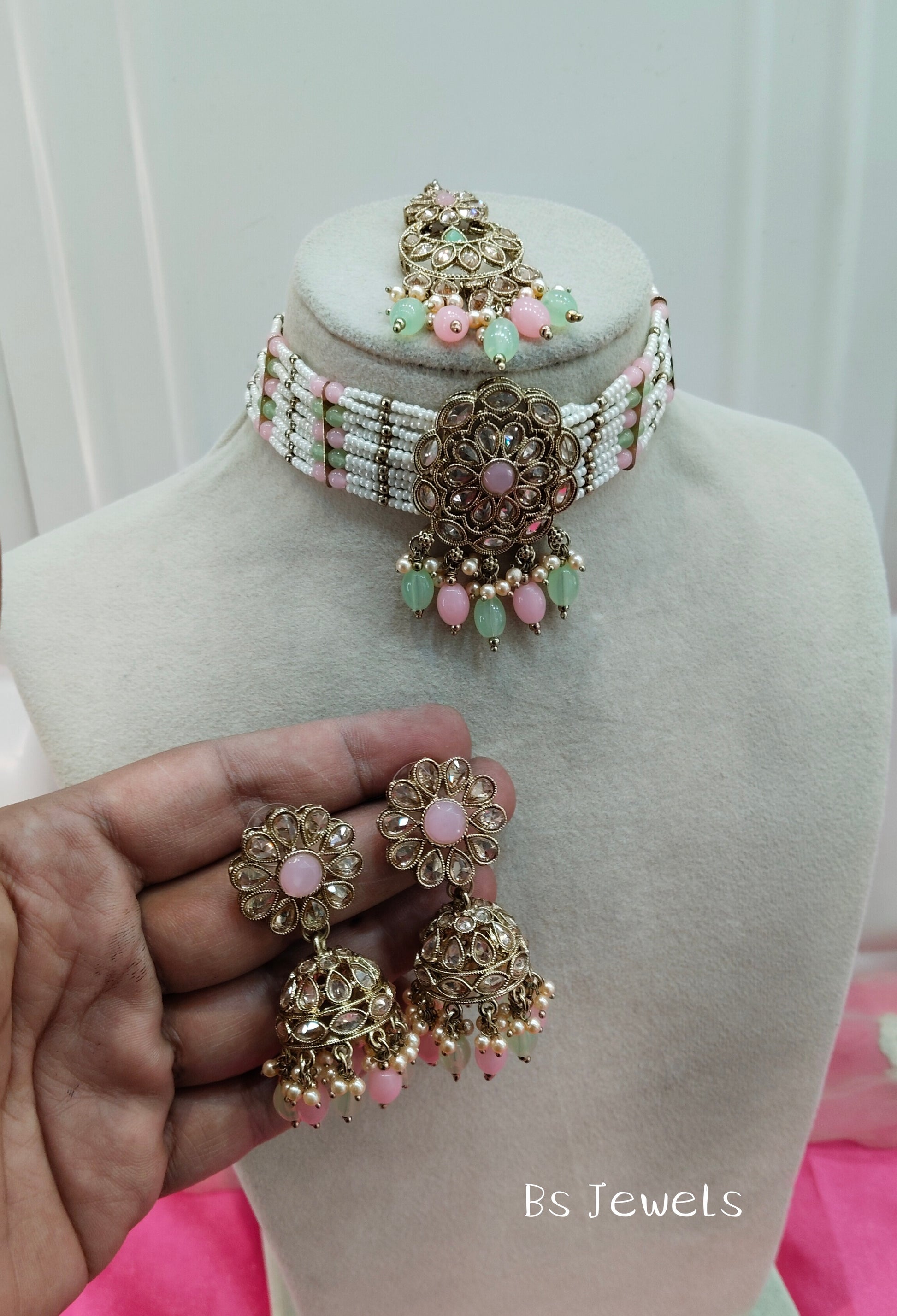 Pista Pink Champagne Stone Choker Jhumka Jewellery Simi Set