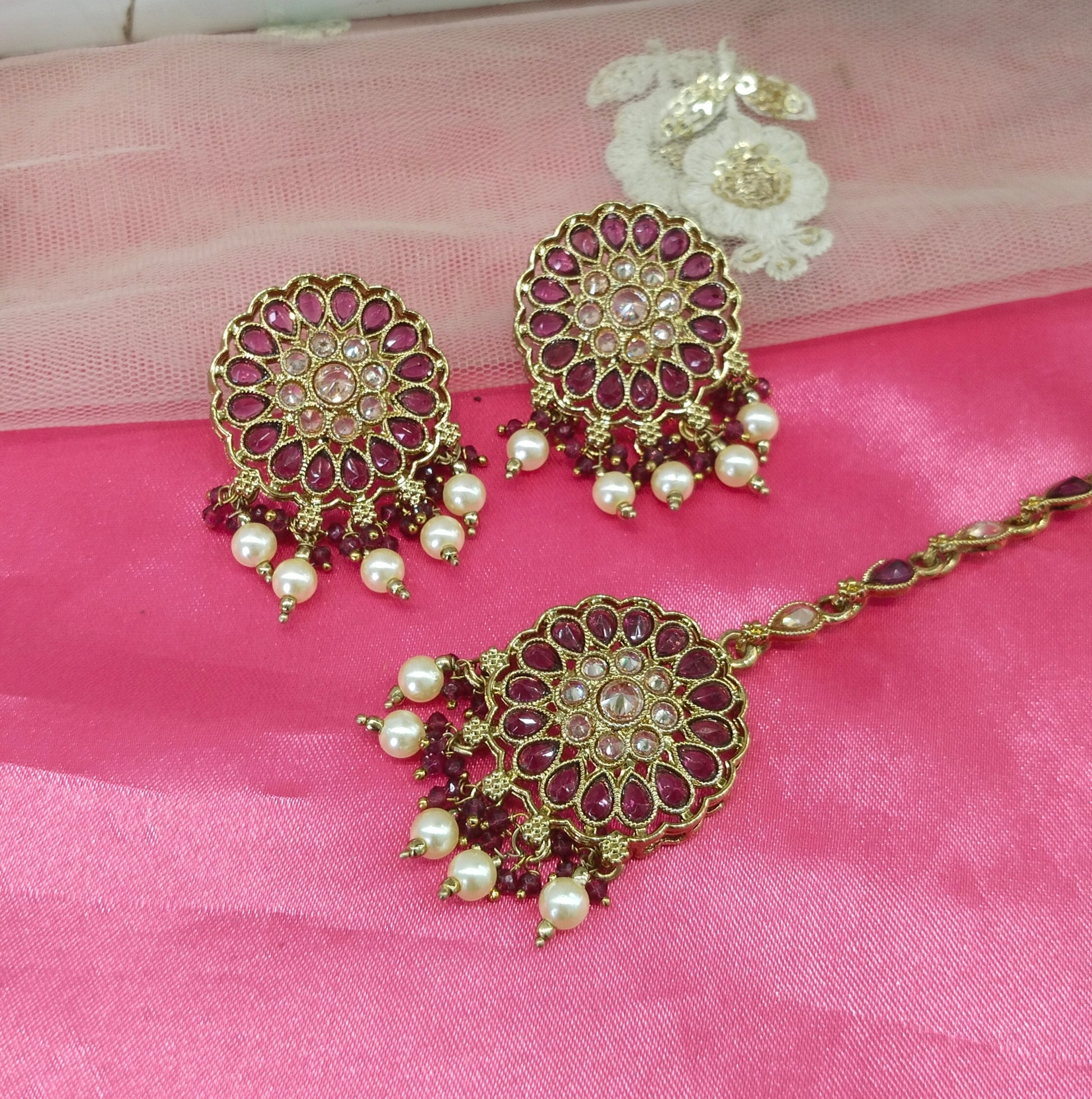 Purple Champagne Gold Preet Bollywood Earrings Tikka Set