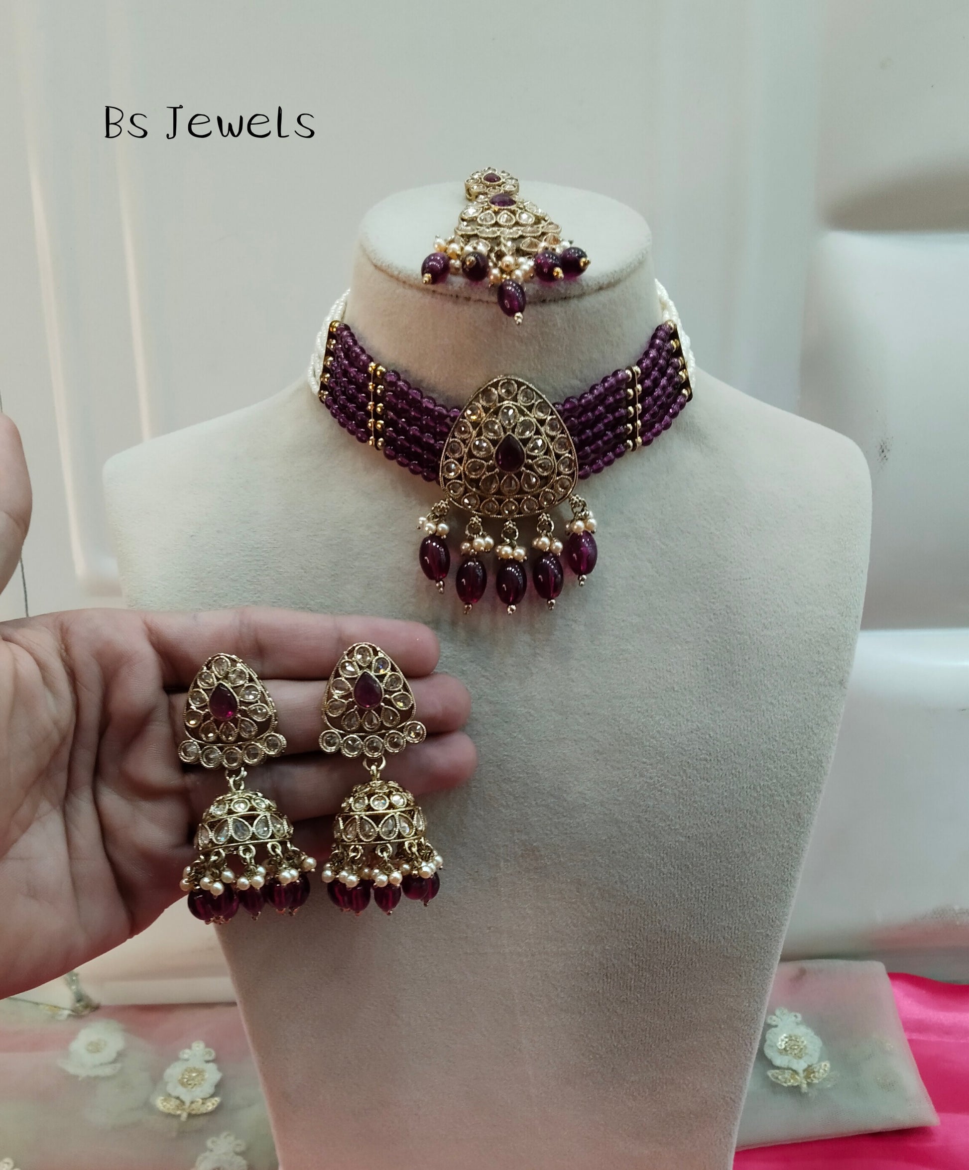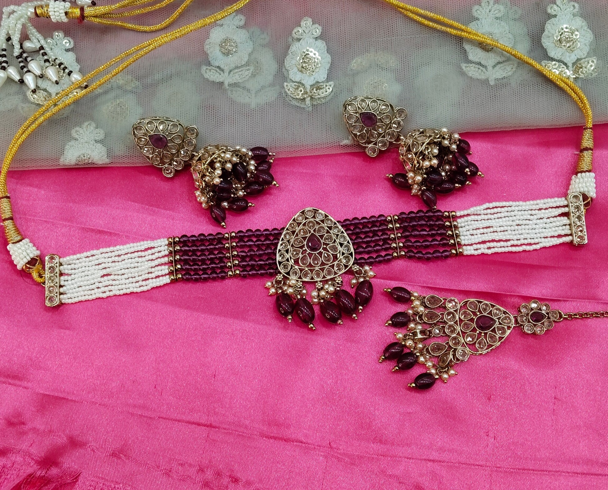 Purple Champagne Stone Jhumka Choker Jewellery Rasha Set