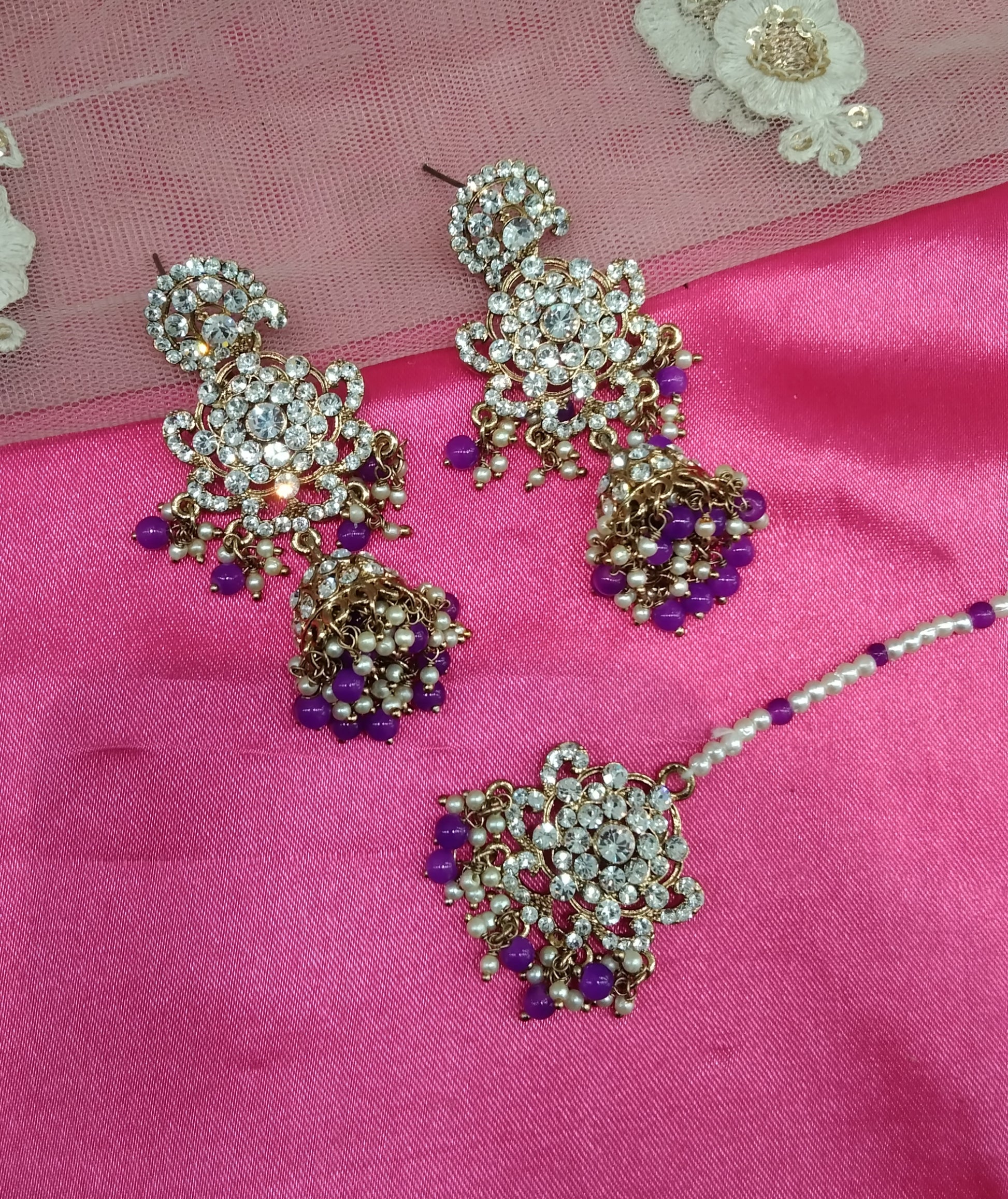 Purple Crystal Ston Jhumka Ways Bollywood Earrings Tikka Set