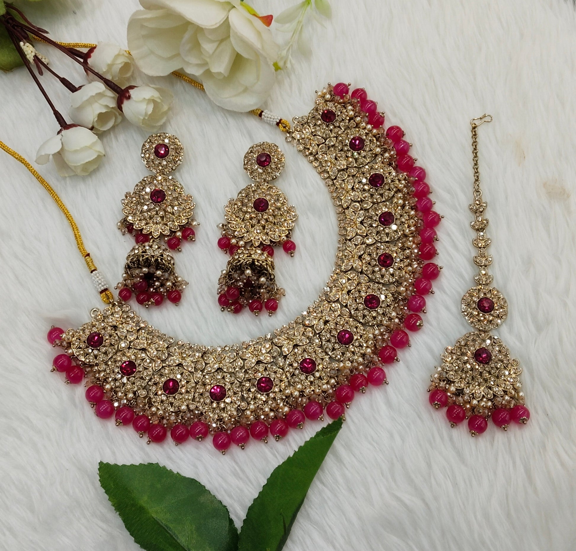 Rani Pink Antique Gold Necklace Jewellery Meenu Set