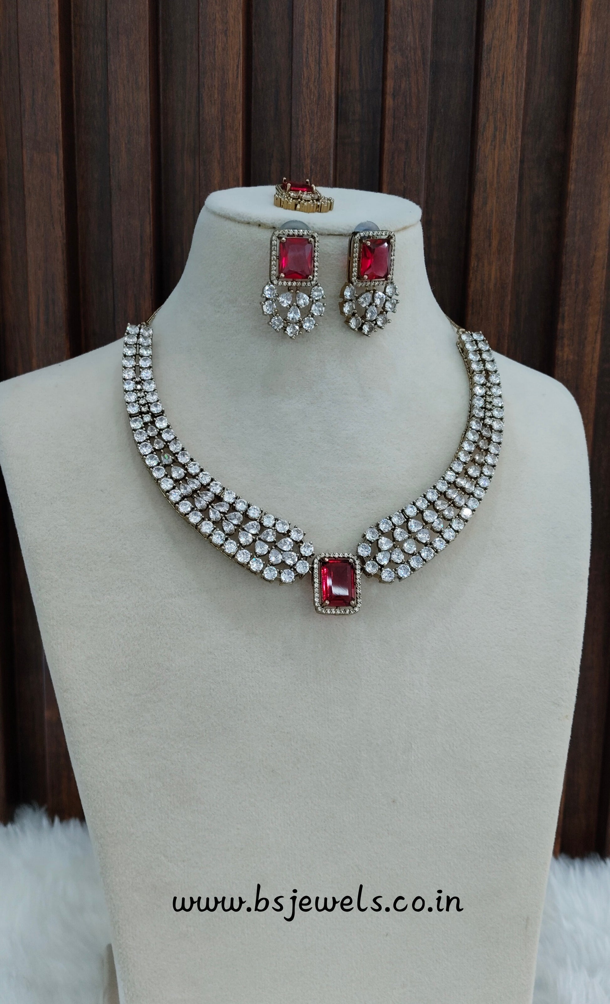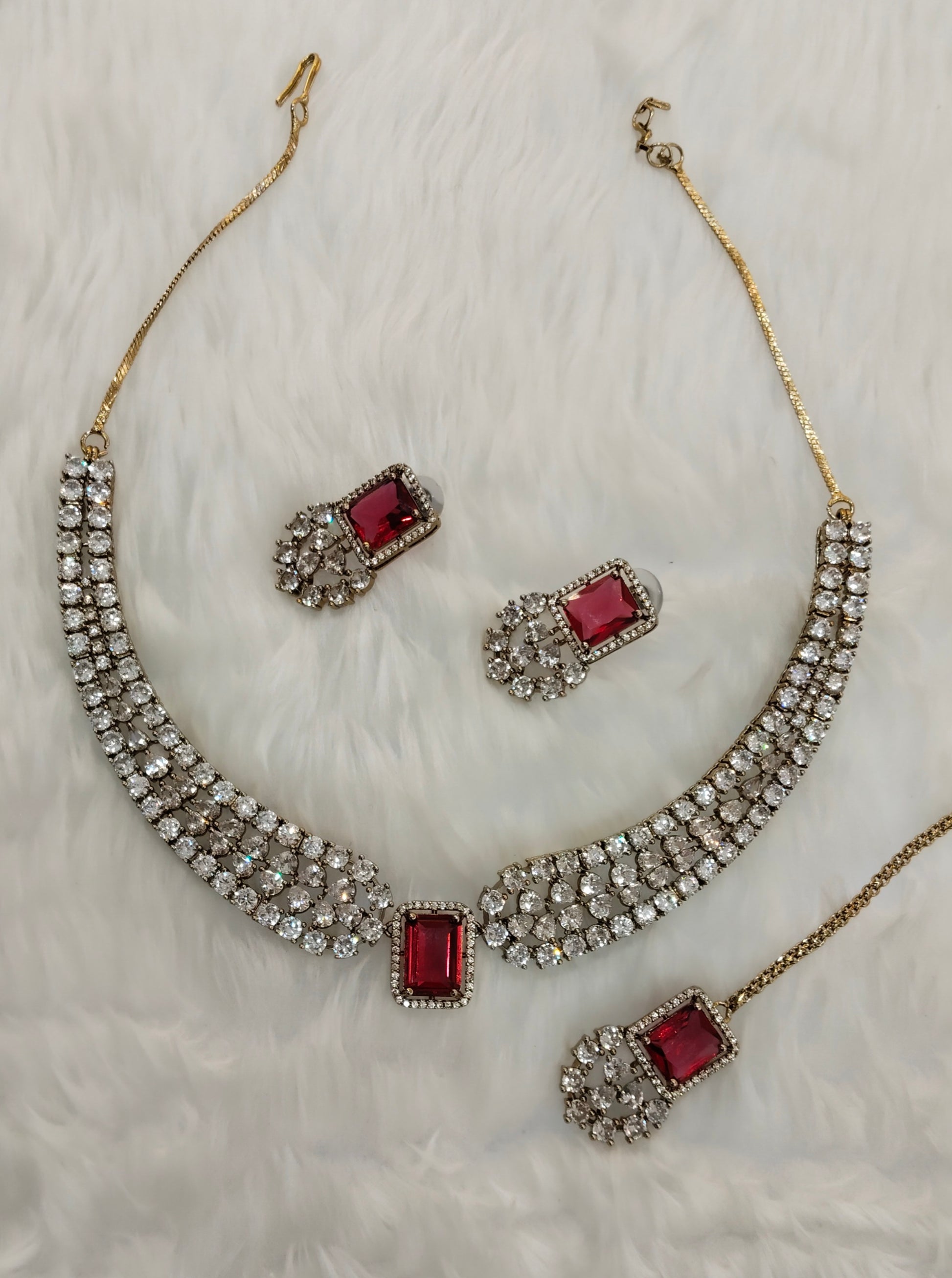 Ruby Antique Gold CZ Necklace Jewellery Tvs Set