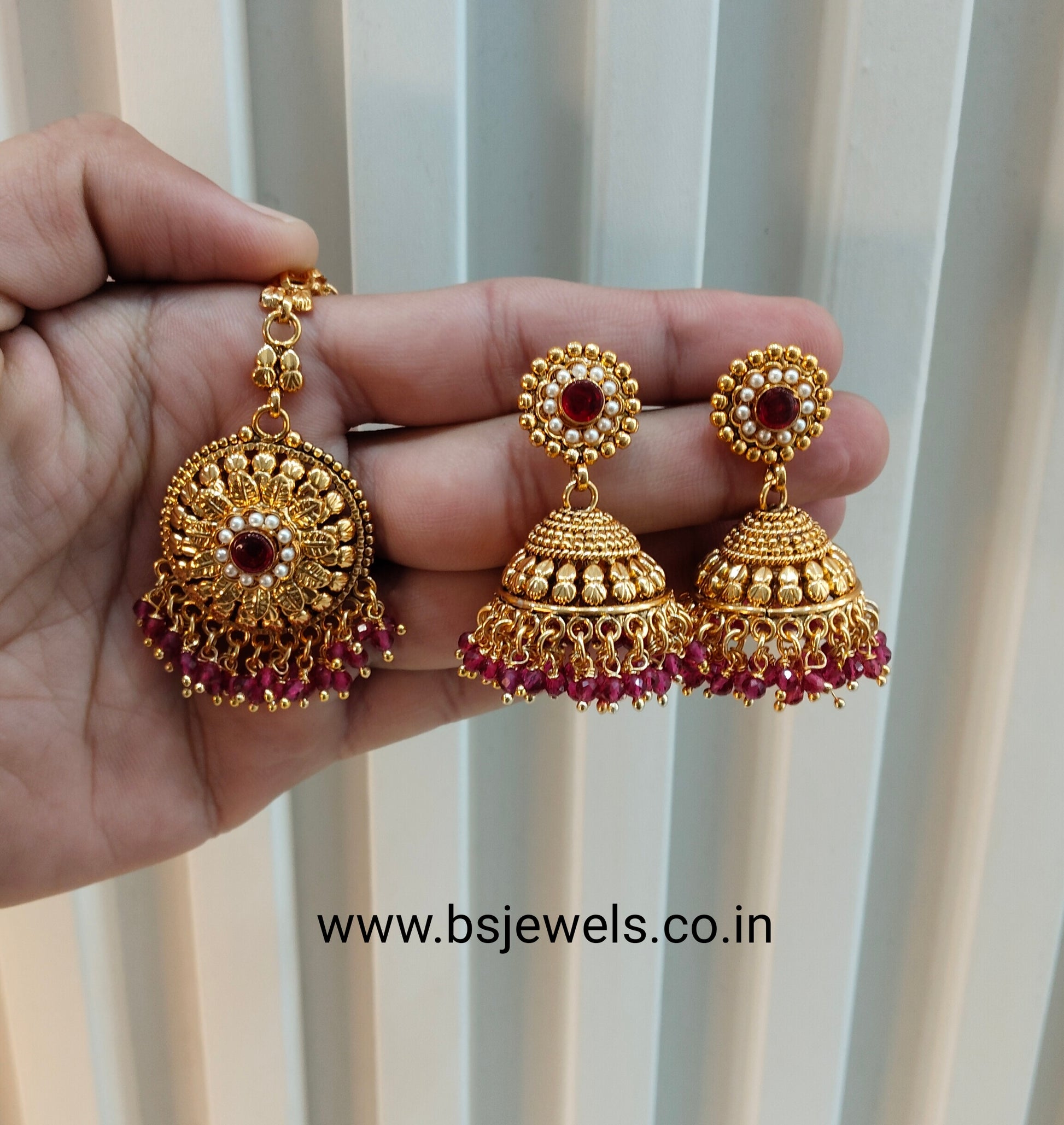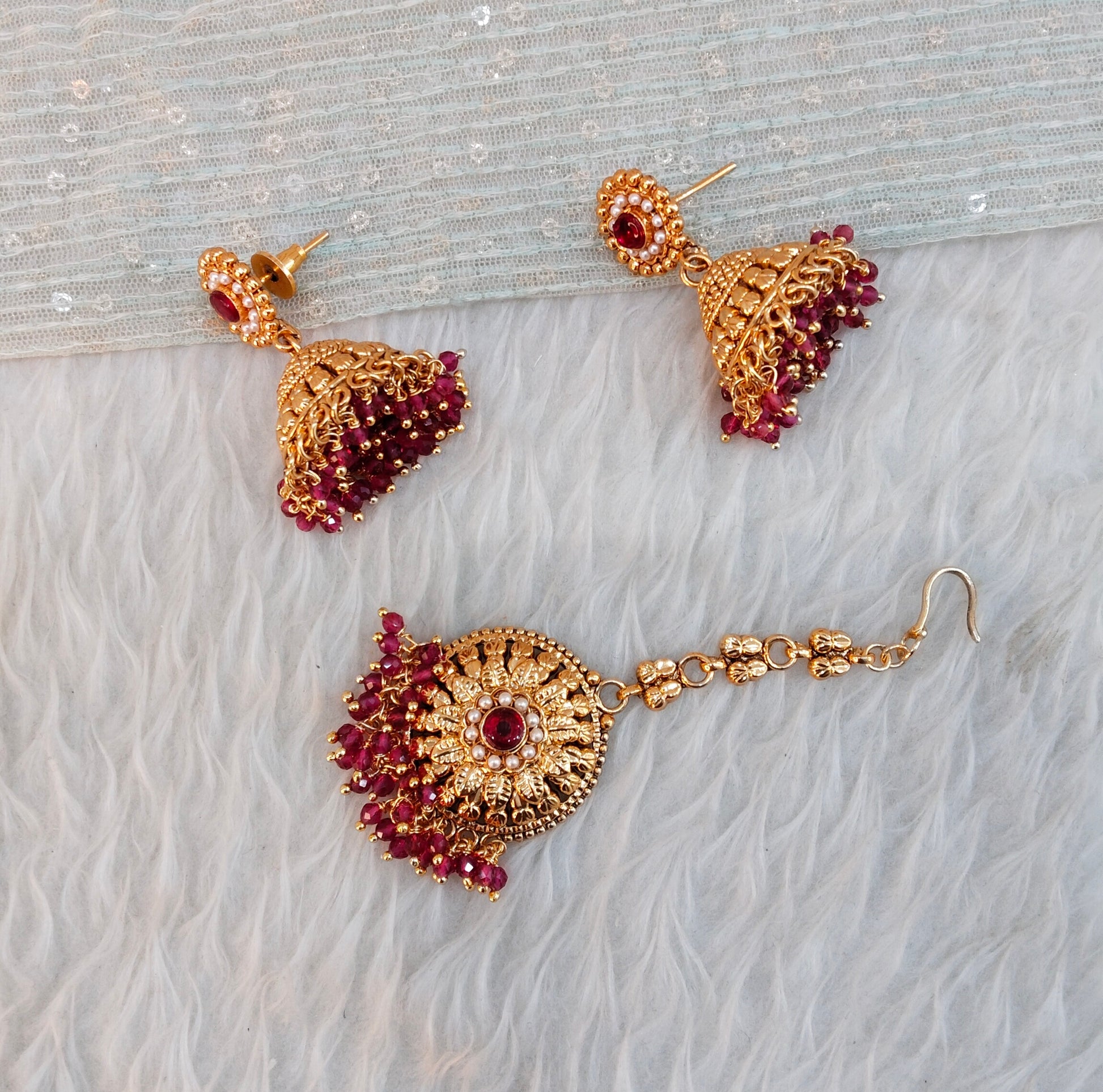 Ruby Gold Jhumki Bollywood Earrings and Tikka