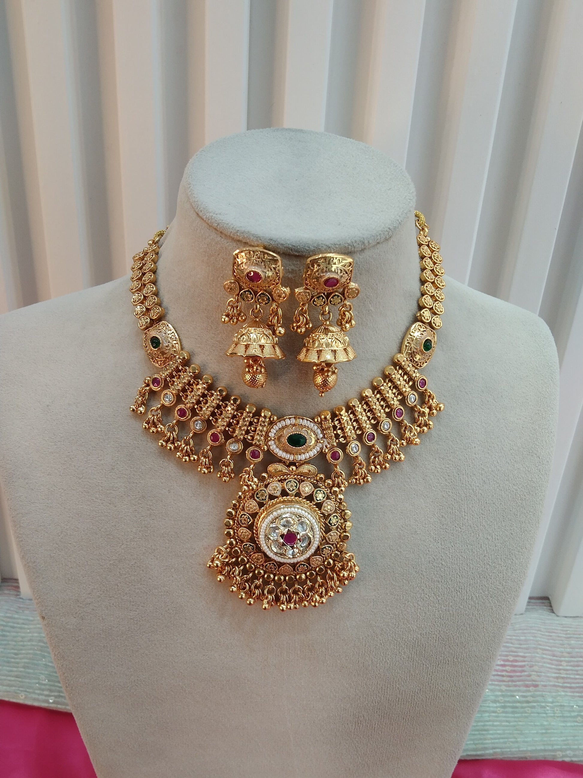 Ruby Green Gold Polki Jhumk Necklace Jewellery Delta Set