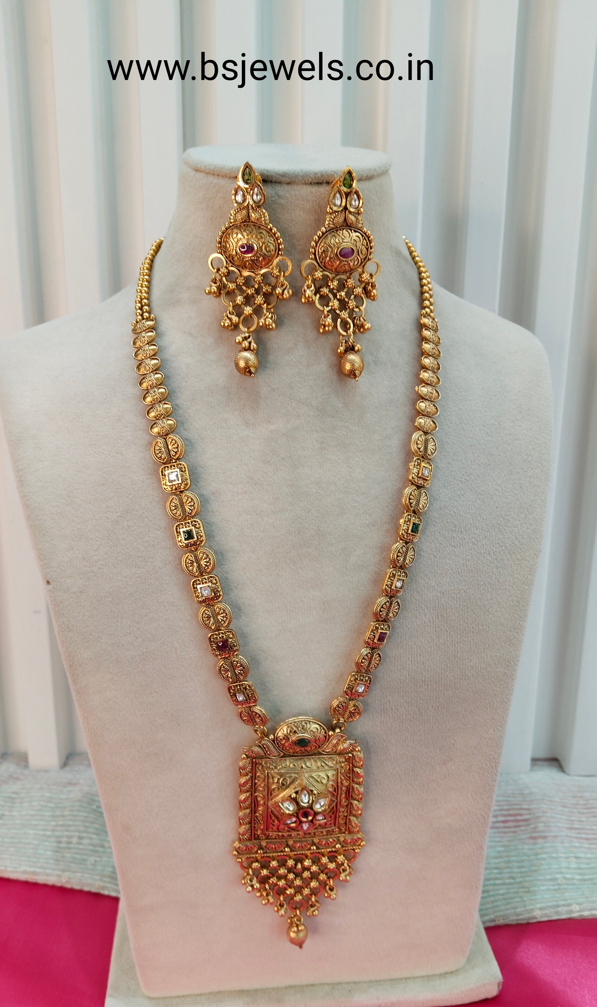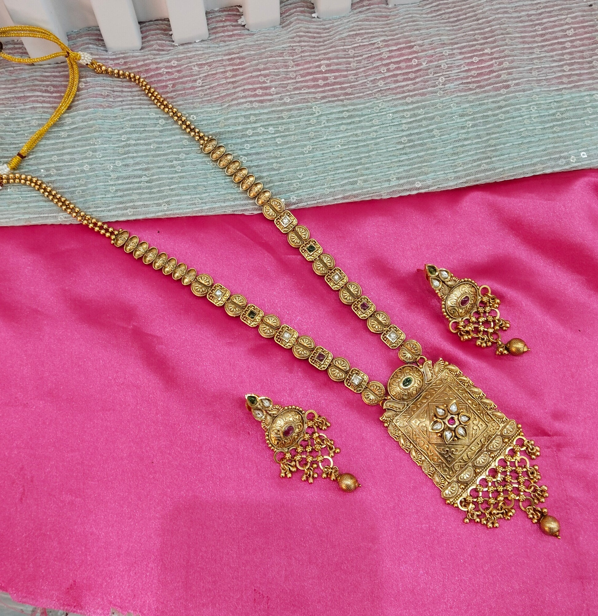 Ruby Green Gold Polki Long Rani Haar Necklace Jewellery Set