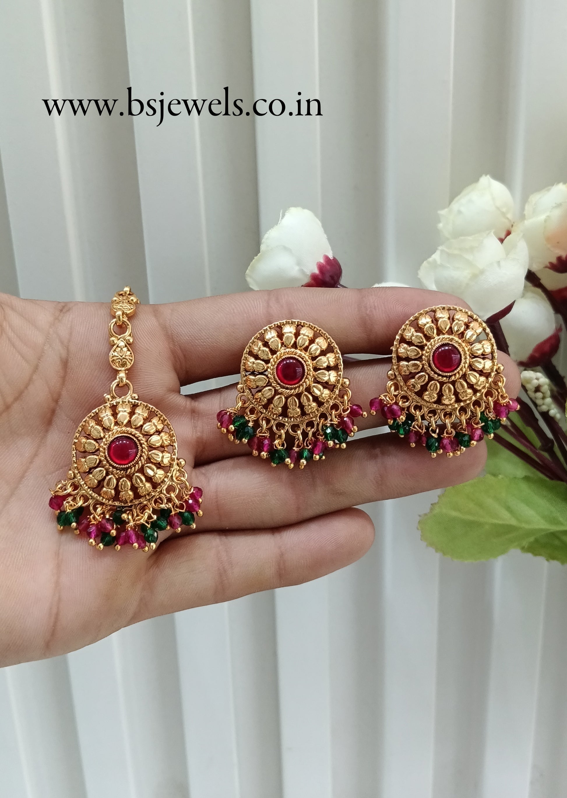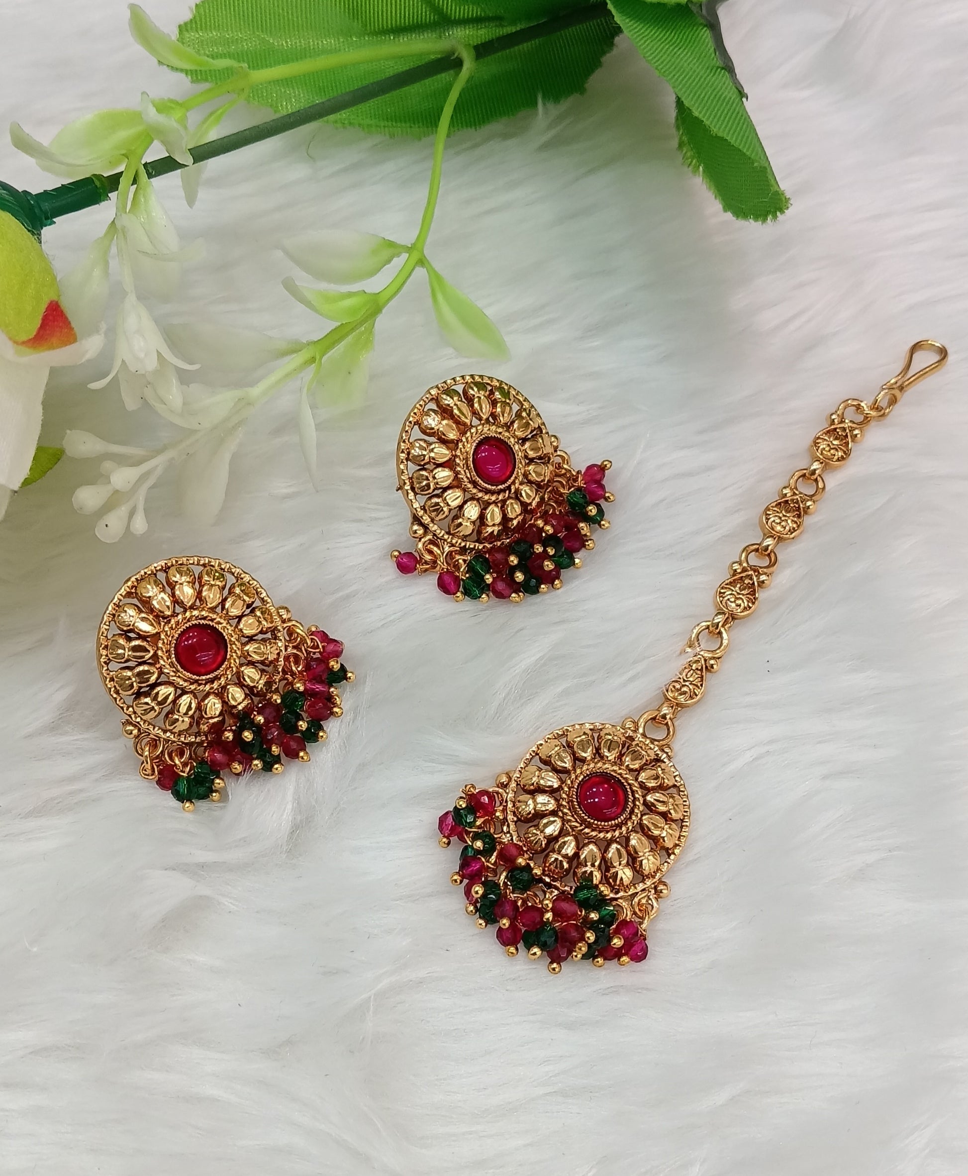 Ruby Green Gold Polki Punjabi Style Earrings and Tikka