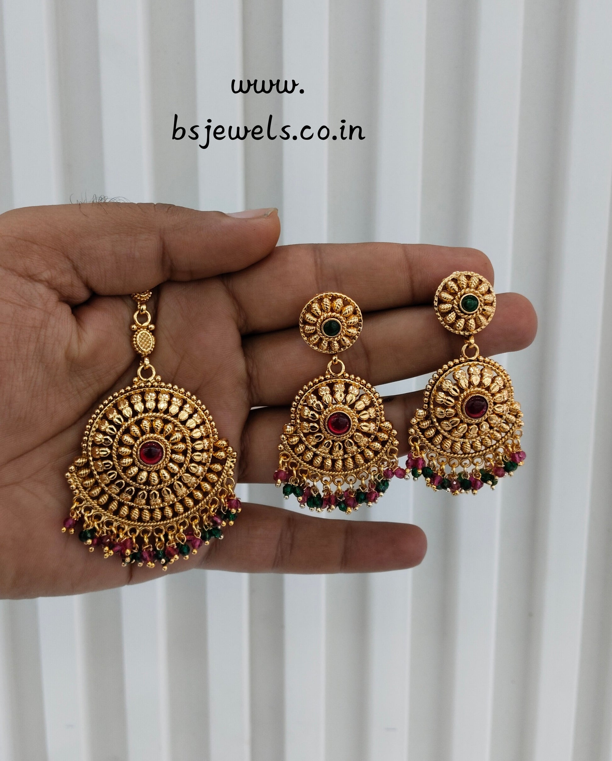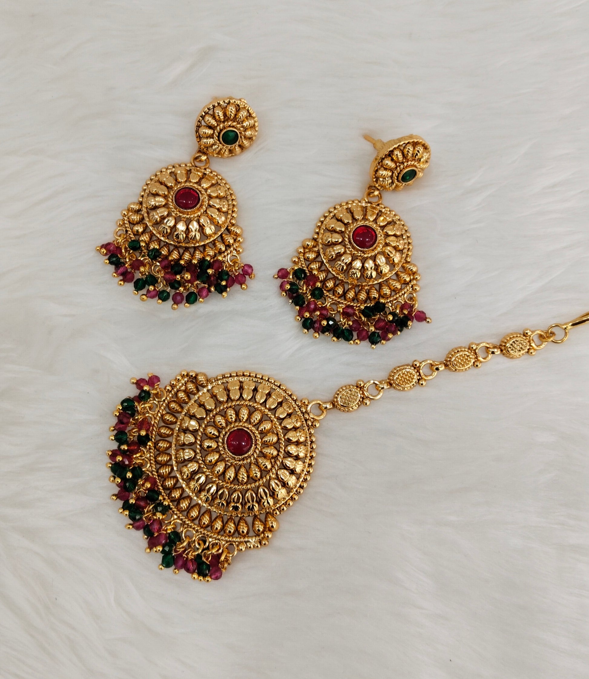 Ruby Green Gold Polki Punjabi Style Earrings and Tikka