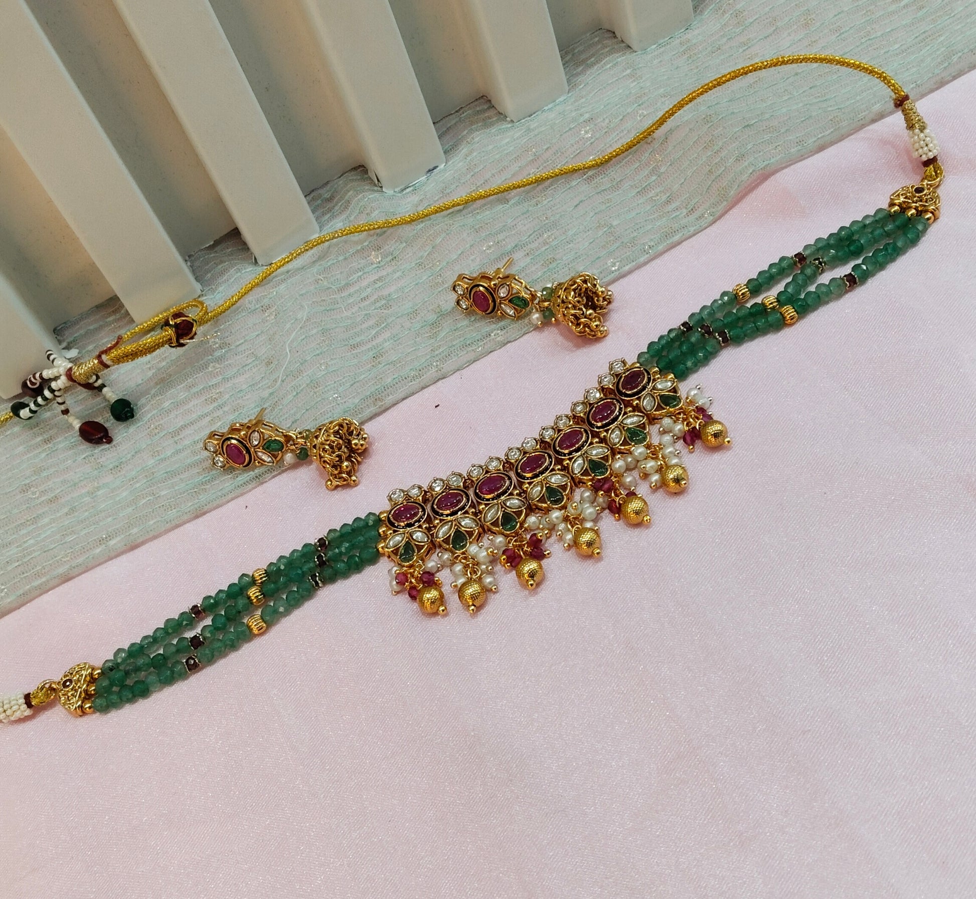 Ruby Sage Green Gold Polki Kundan Choker Necklace Jhumki Jewellery Jennet Set