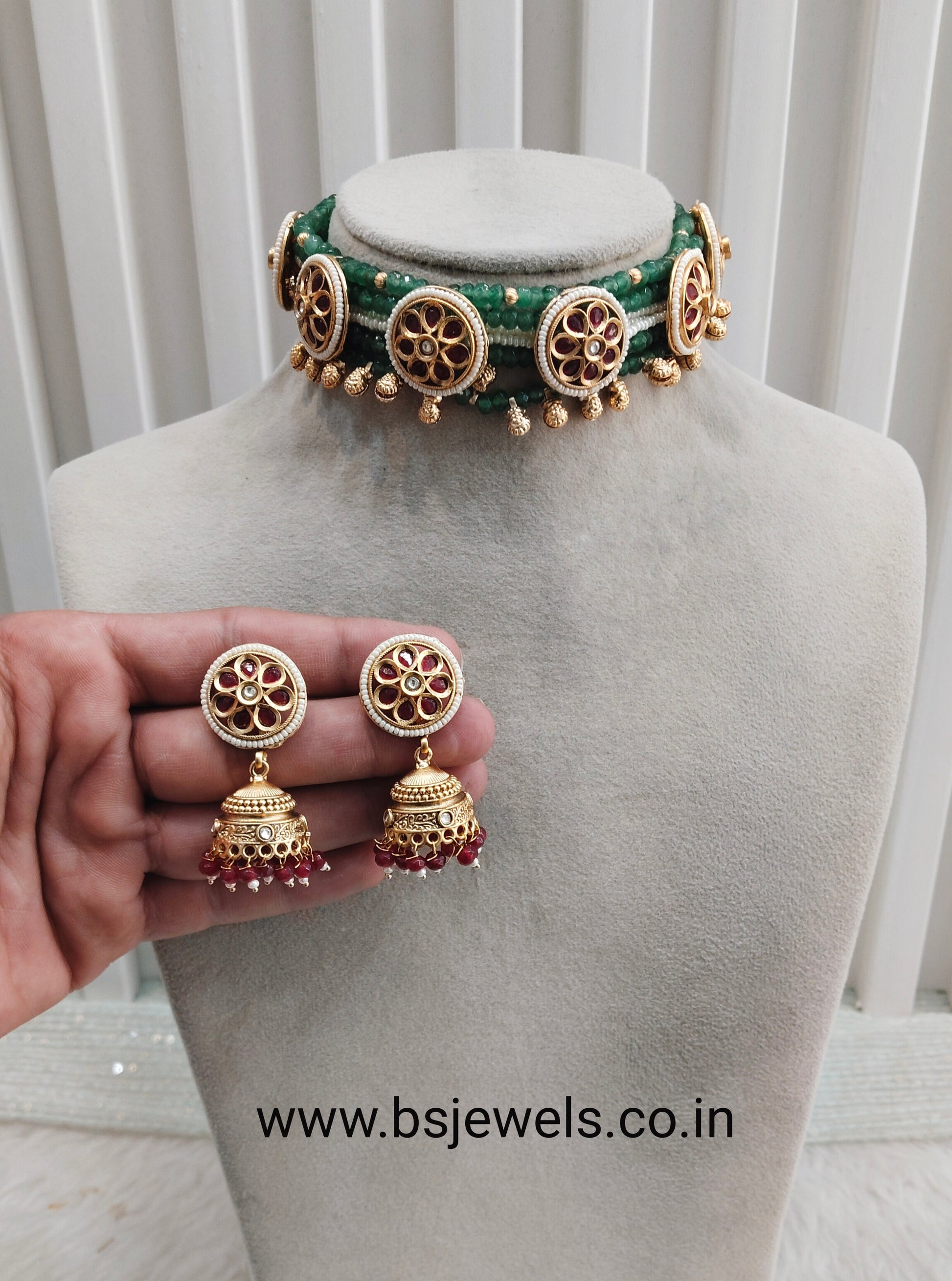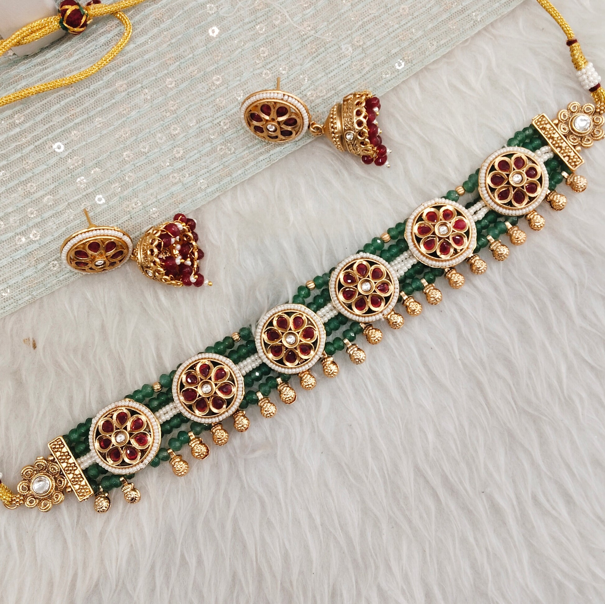 Ruby Sage Green Gold Polki Choker Jewellery Rossy Set