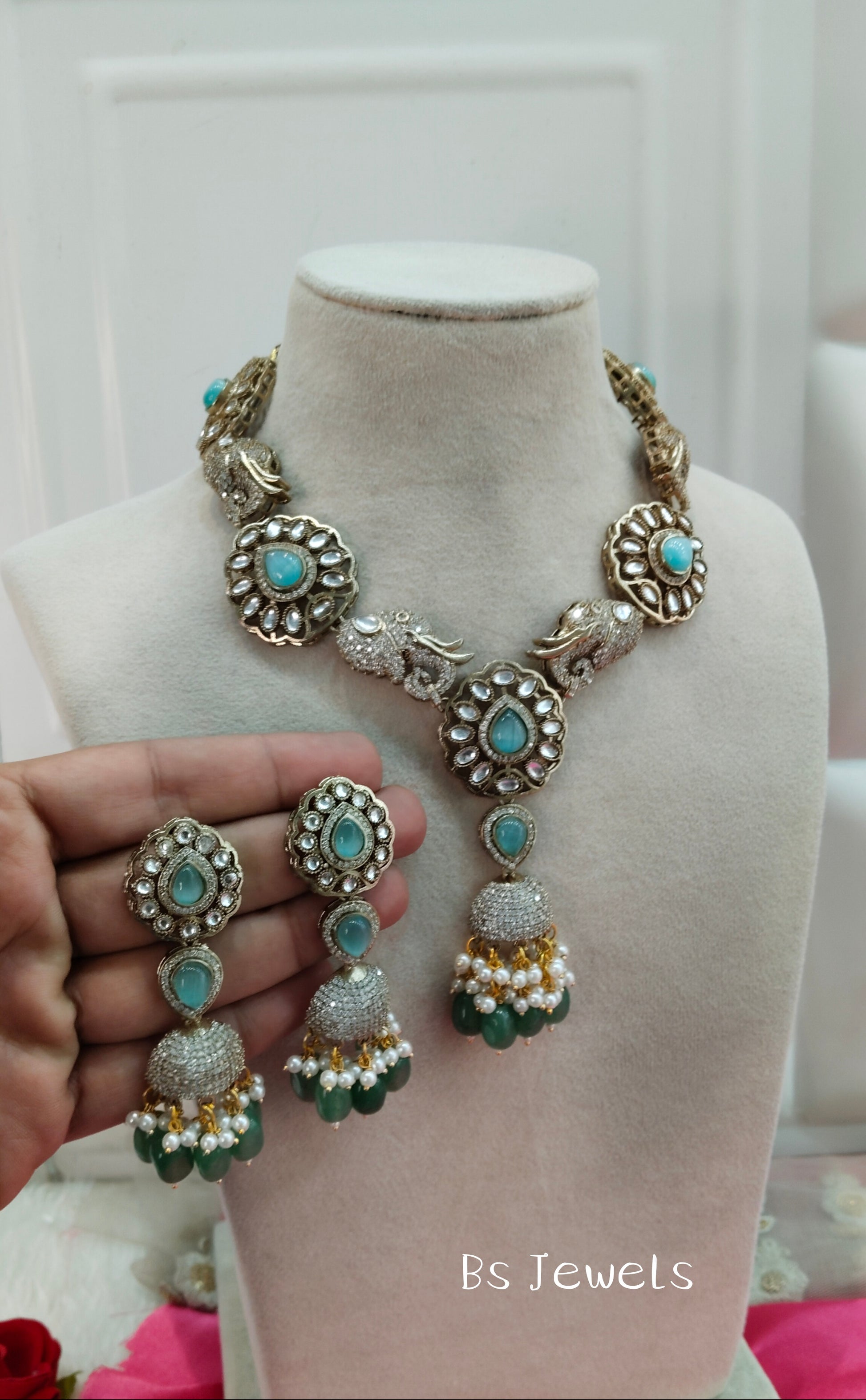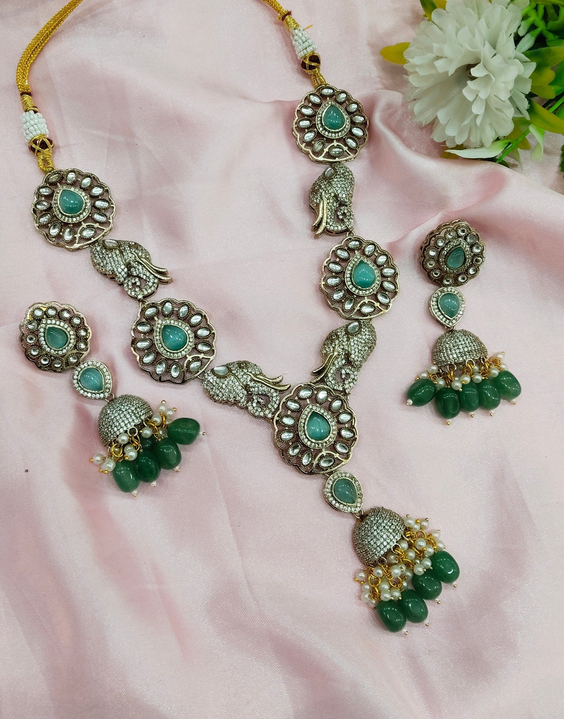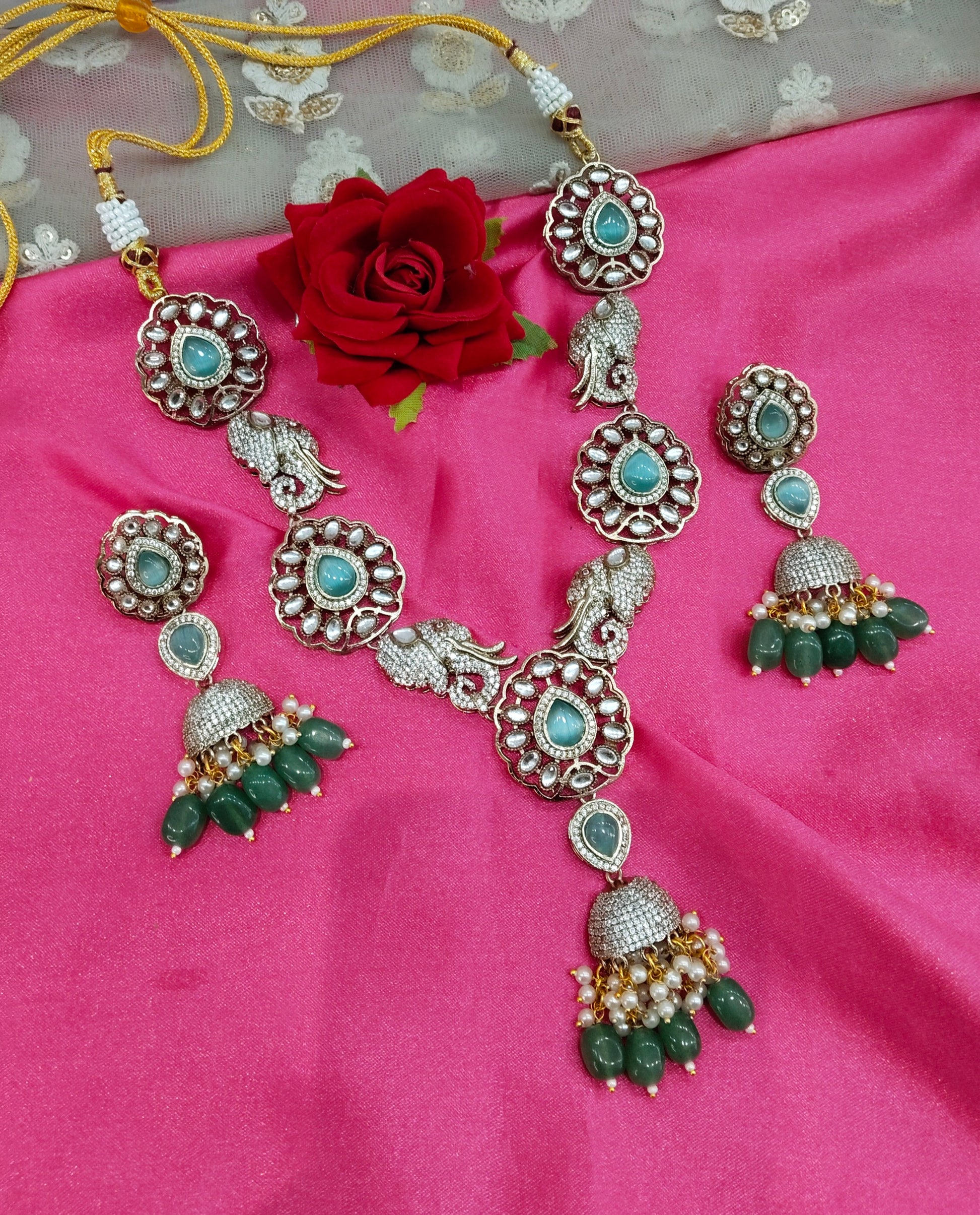 Sage Green Moissanite Kundan Long Rani Haar Necklace Jewellery Bobby Set
