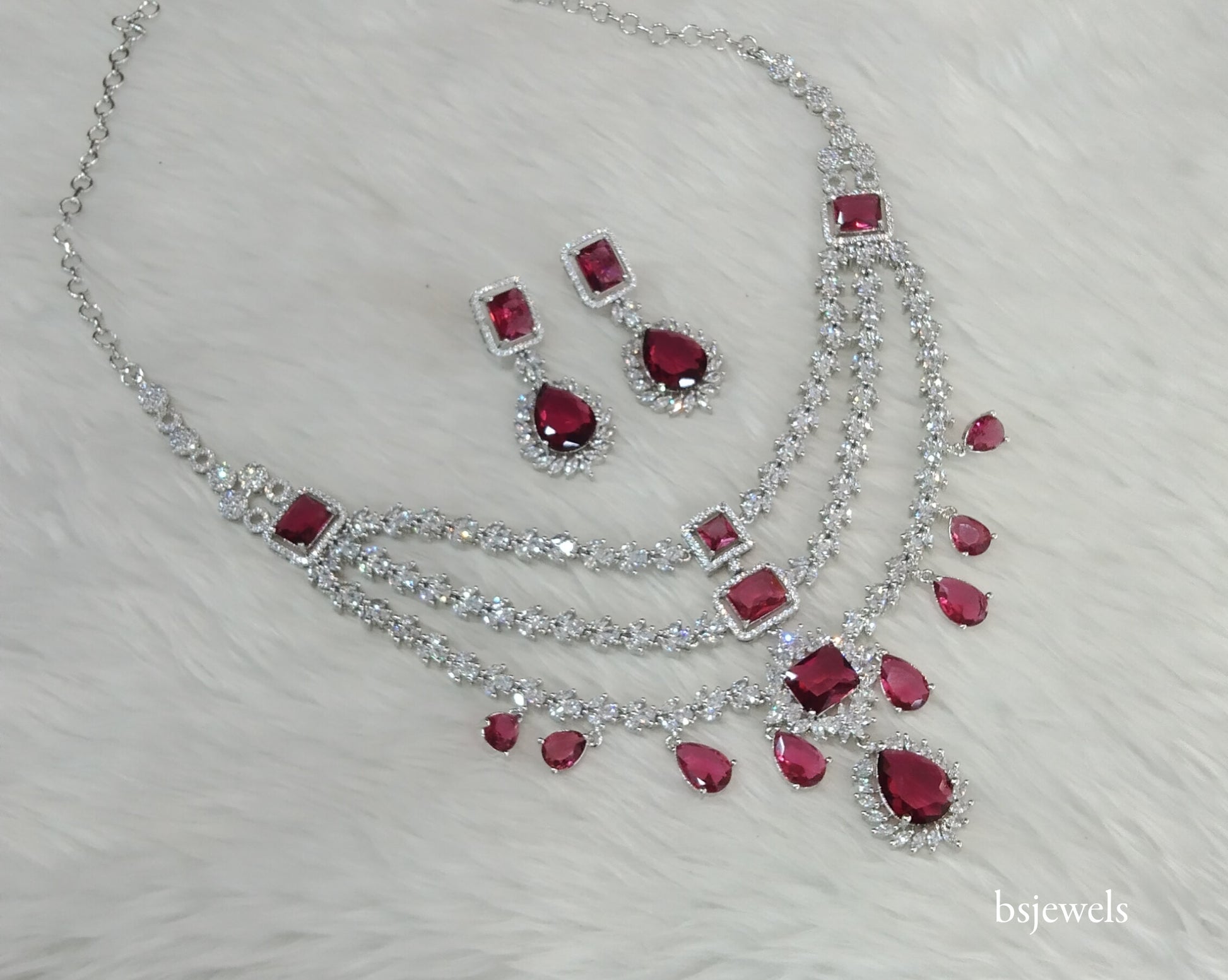 Silver Ruby American Diamond Ad Jasnoor Necklace Set