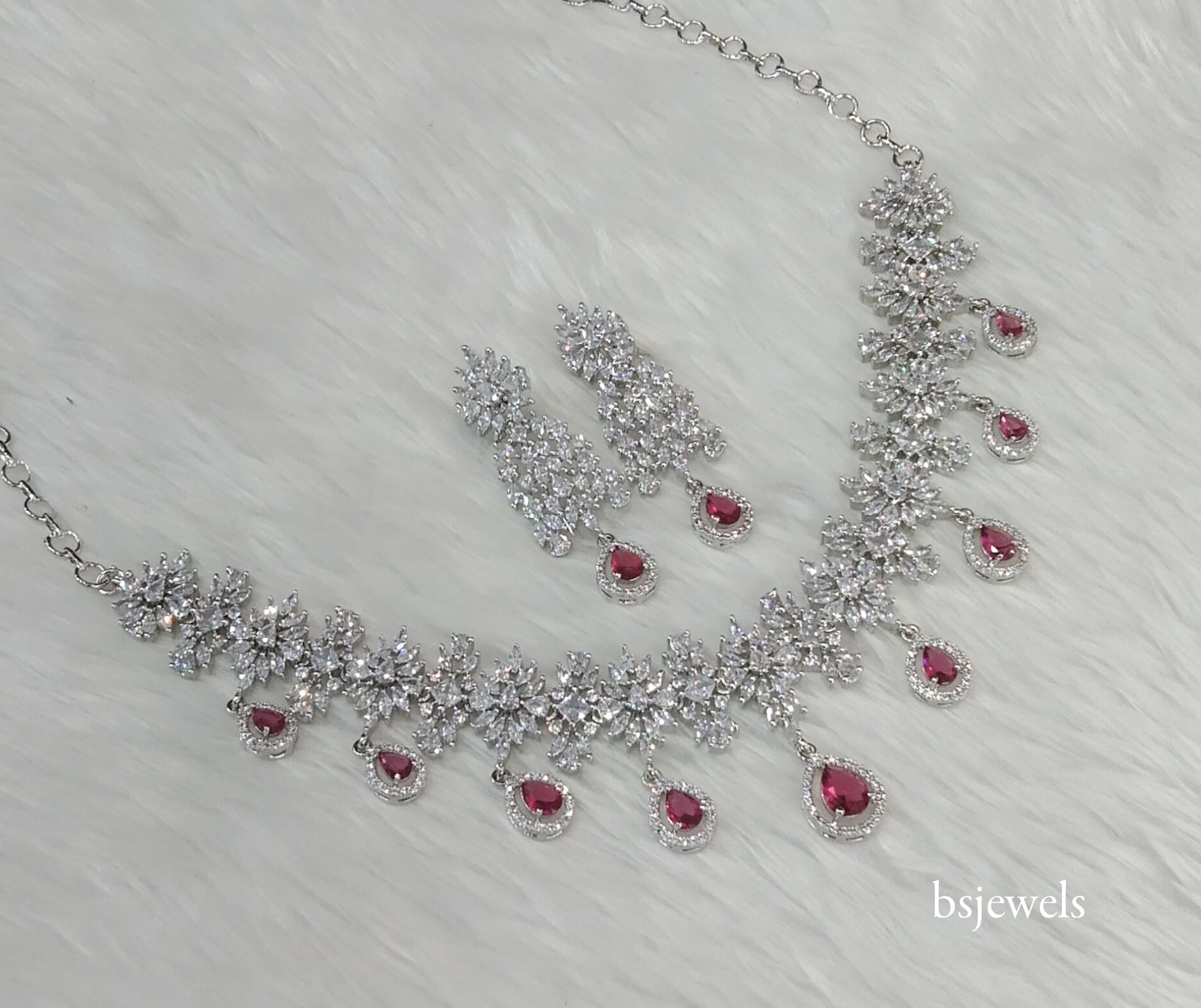 Silver Ruby American Diamond Ad Jassu Necklace Set