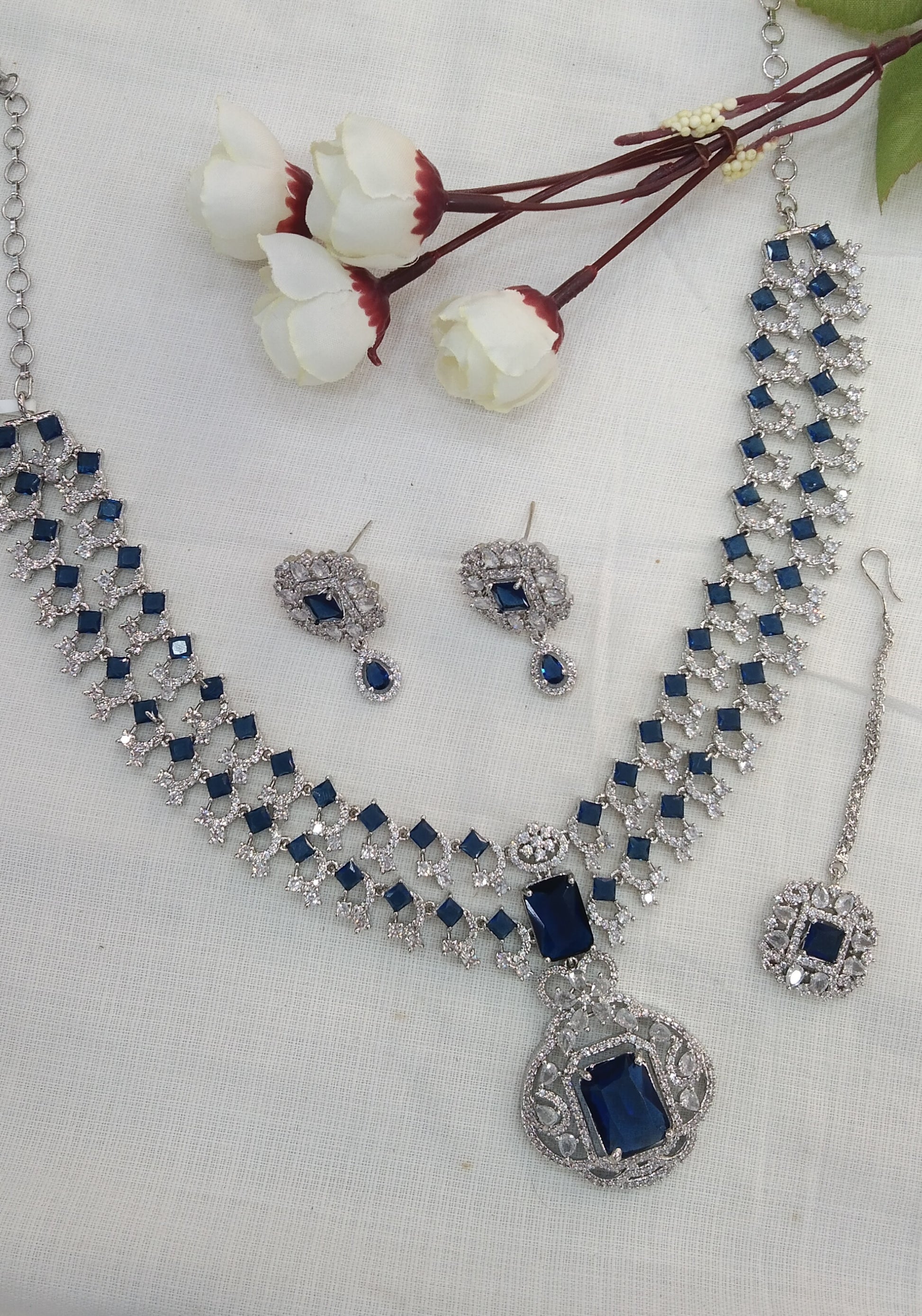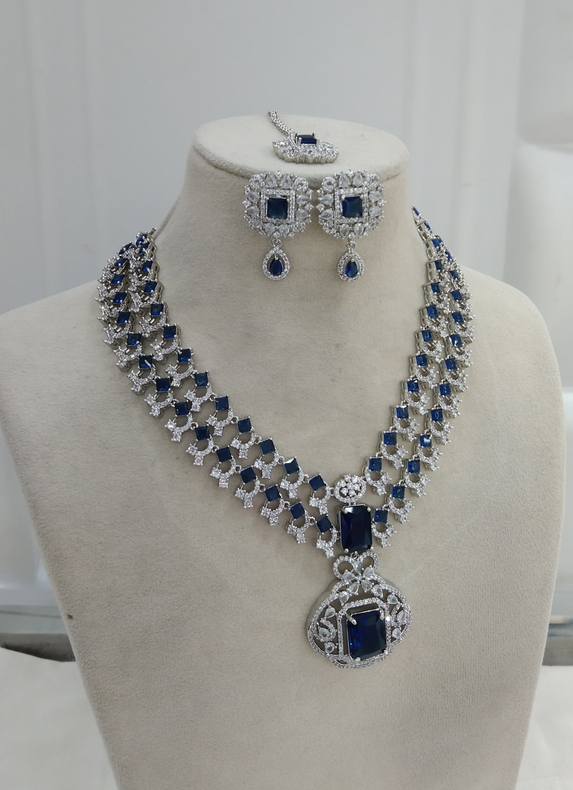 Silver American Diamond Blue Cz Necklace Jewellery kato Set