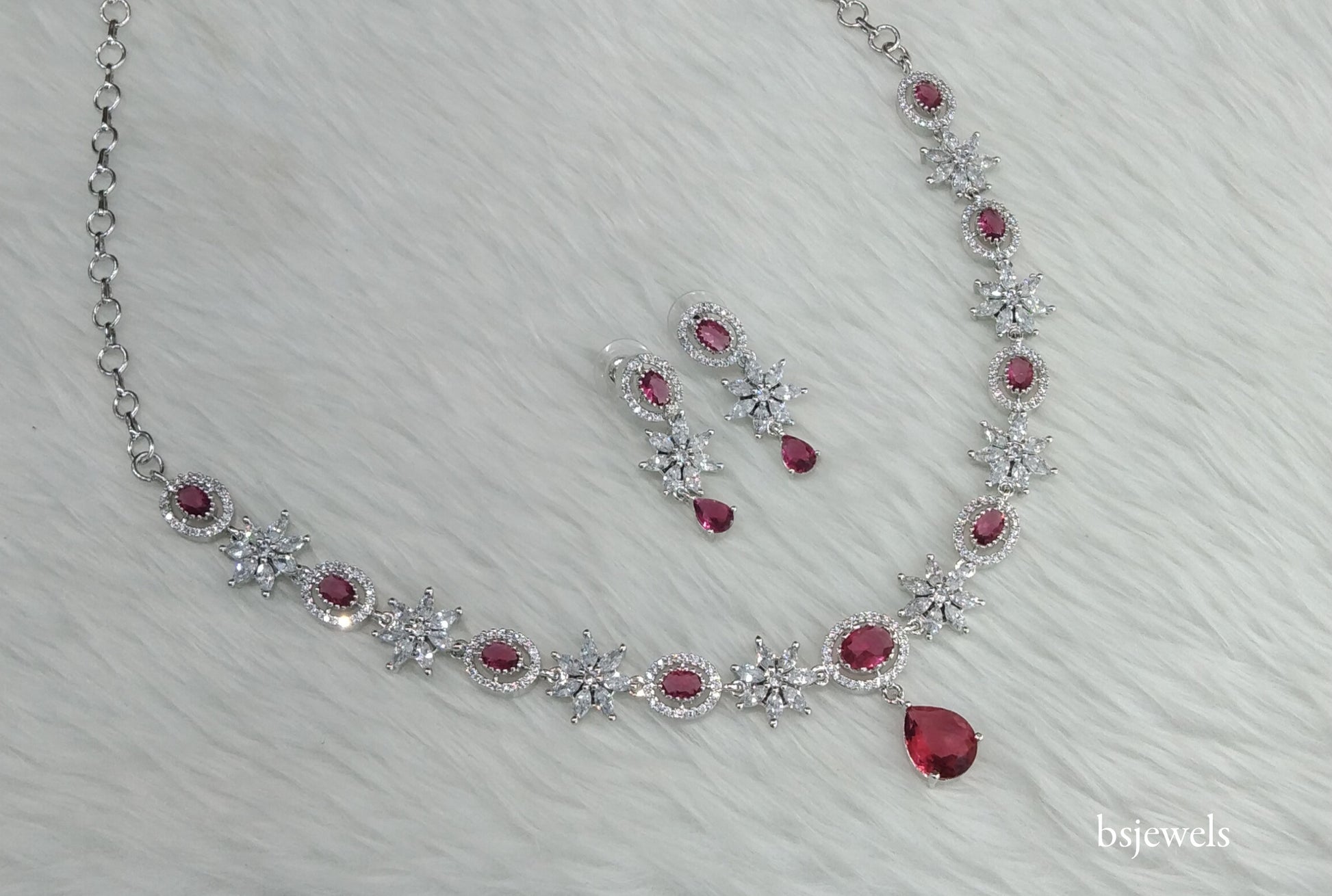 Silver Ruby American Diamond Ad Tania Necklace Set