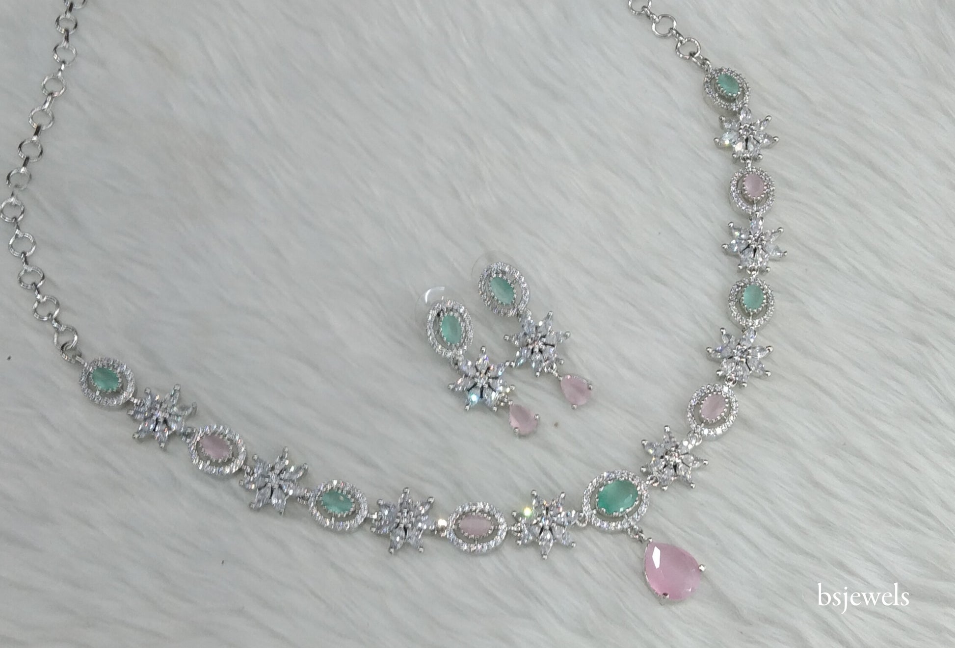 Silver Mint Pink American Diamond Ad Tania Necklace Set