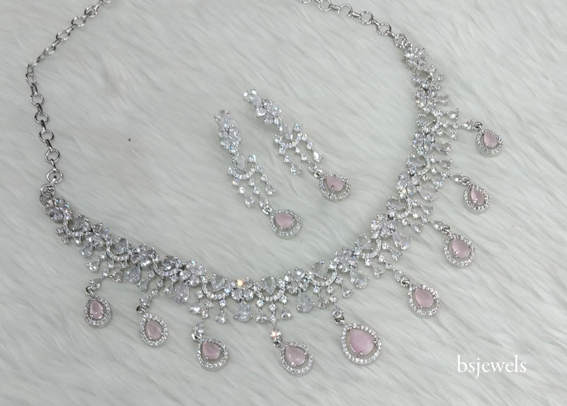 Silver Pink American Diamond Ad Gaggi Necklace Set