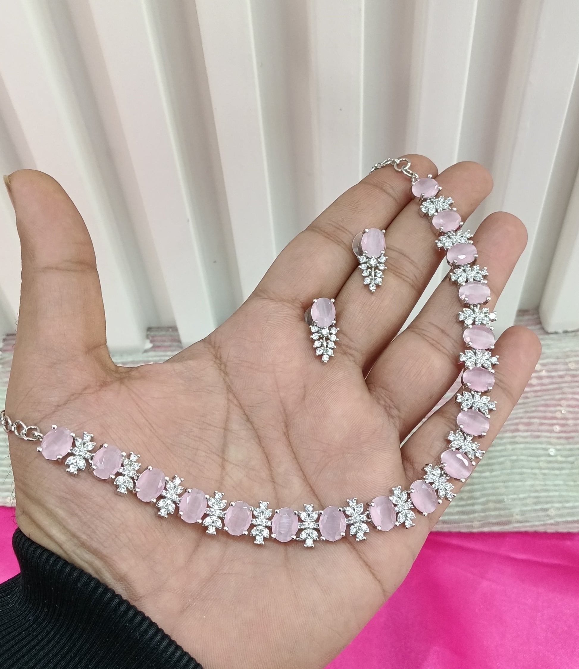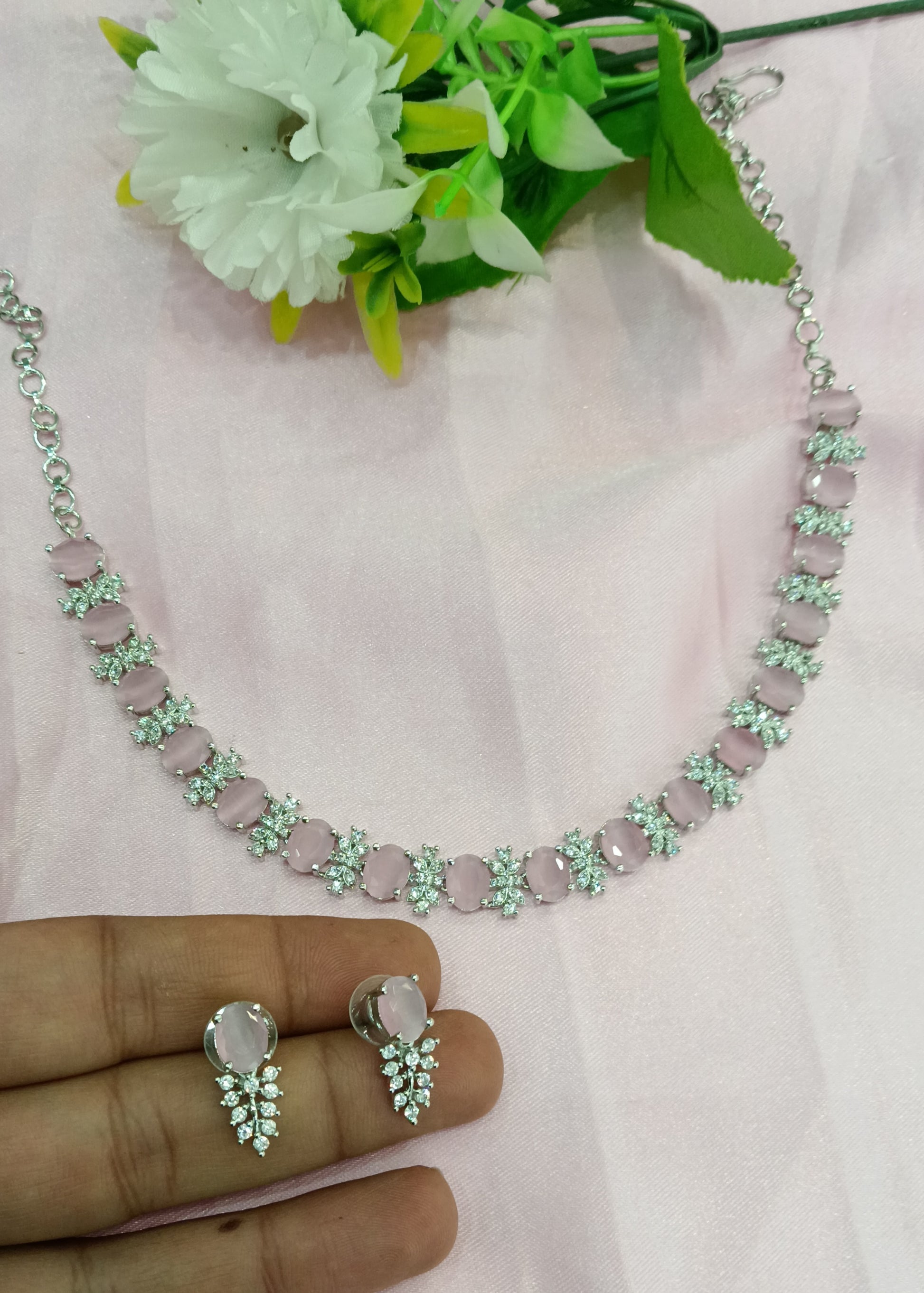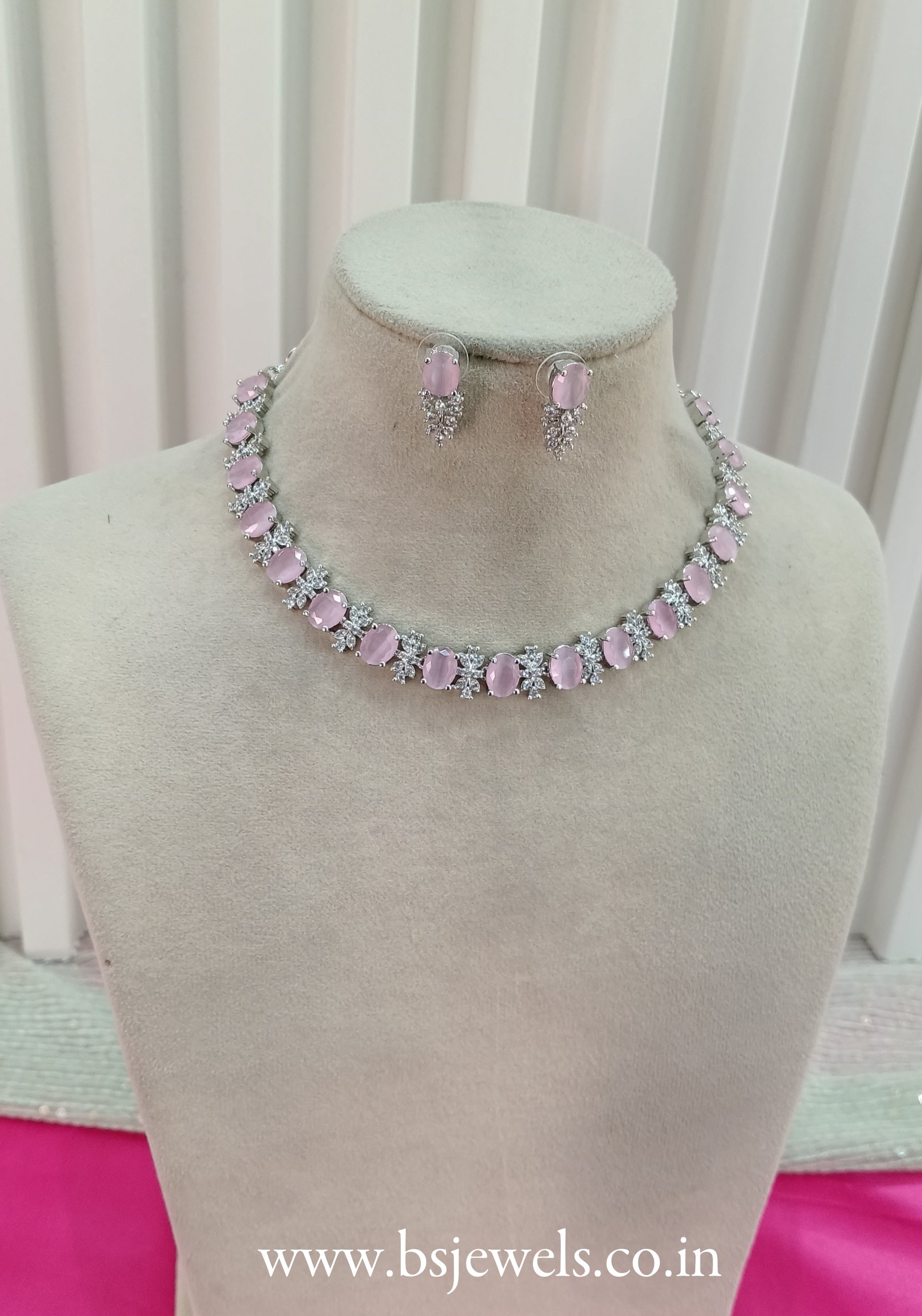 Silver Pink American Diamond Cz Necklace Jewellery Aujla Set