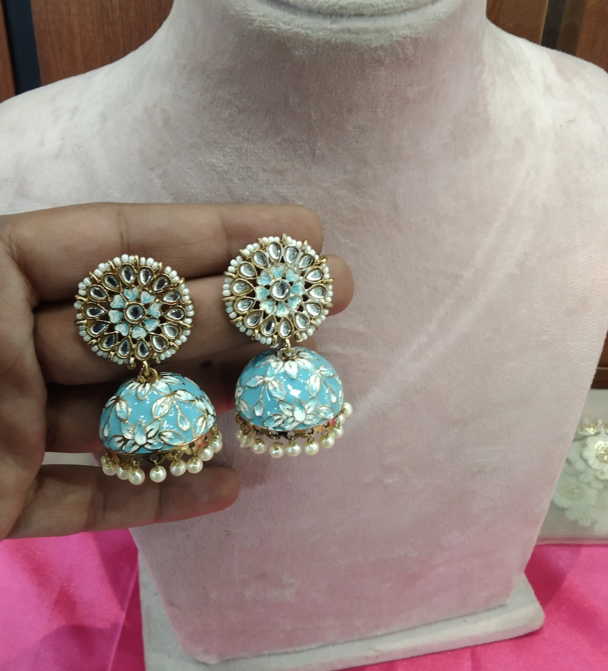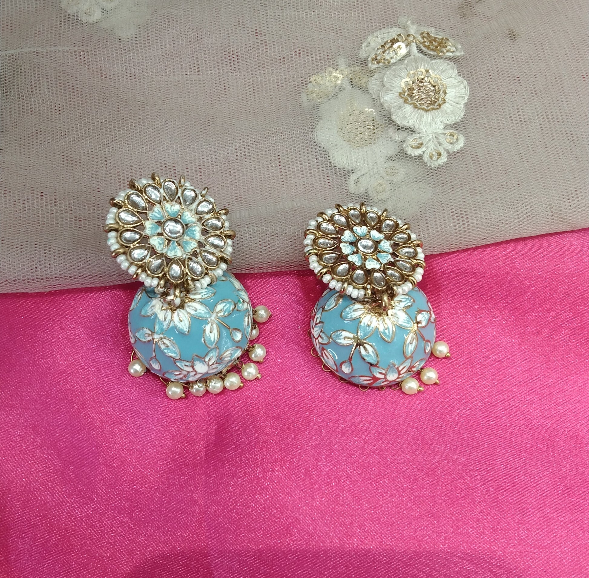 Sky Blue Kundan Meenakari Jhumka Alone Bollywood Earrings