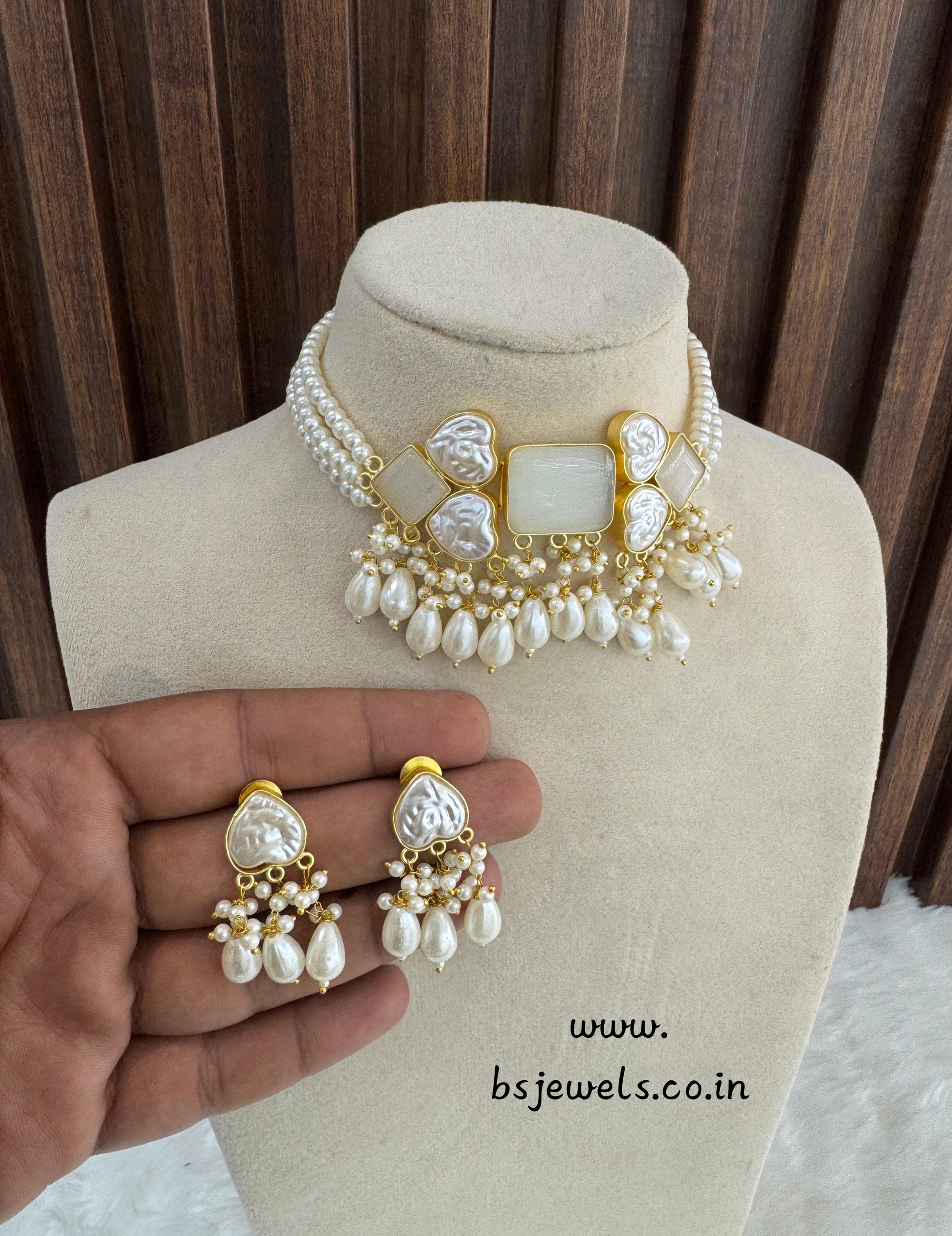 White Mother Of Pearl Stone Chokar Jewellery olivia Set