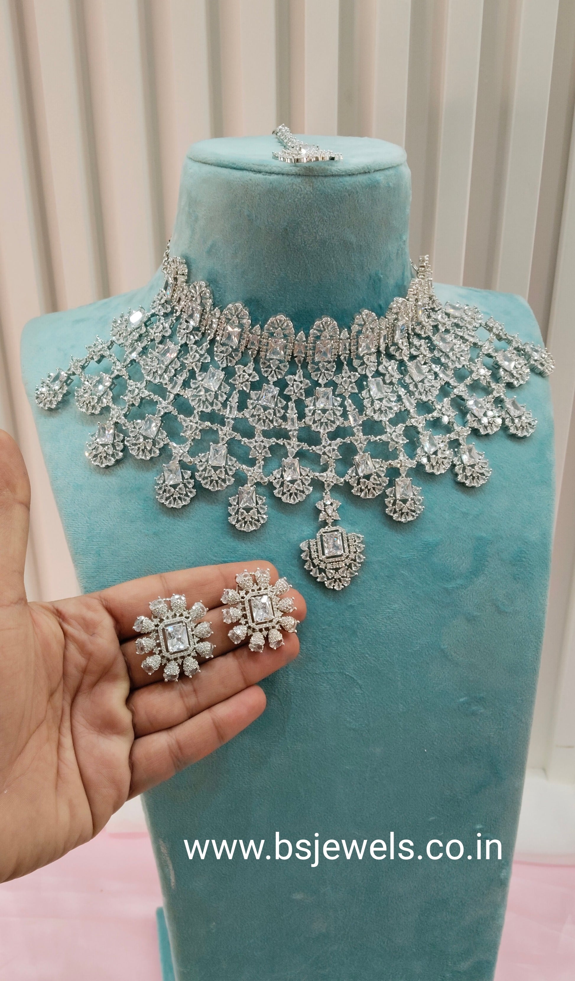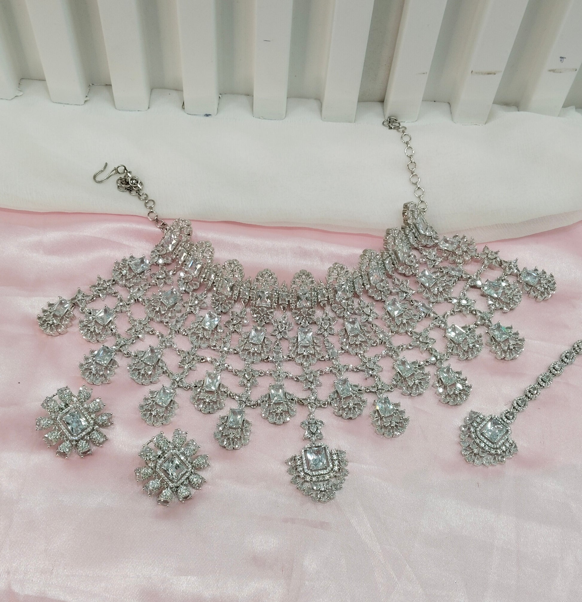 White Silver CZ Bridal Necklace Choker Jewellery Kiara Set